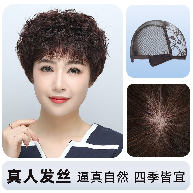 工場直売かつら全頭カバー女性真人髪糸自然短巻きかつらカバー中高年かつら女性真髪