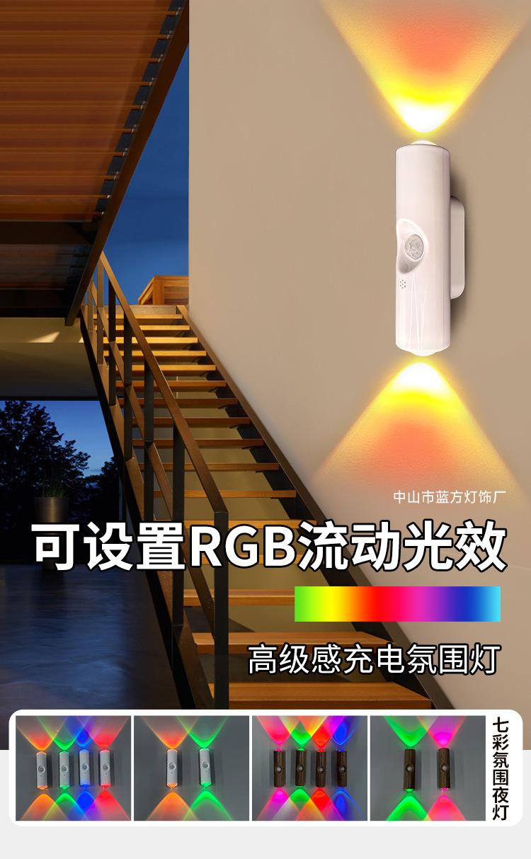 跨境新款智能人体感应灯七彩氛围灯充电感应壁灯卧室人过道小夜灯