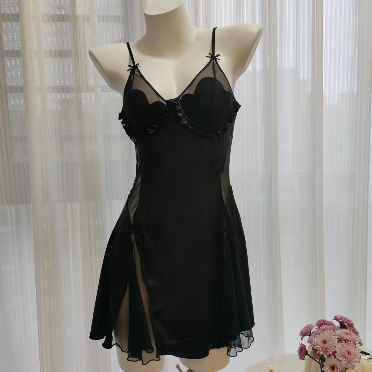 2025年新作 フレンチロマンティックレース シースルー ネグリジェ セクシー アイスシルク 胸パッド付き キャミソール ショートドレス ホームウェア