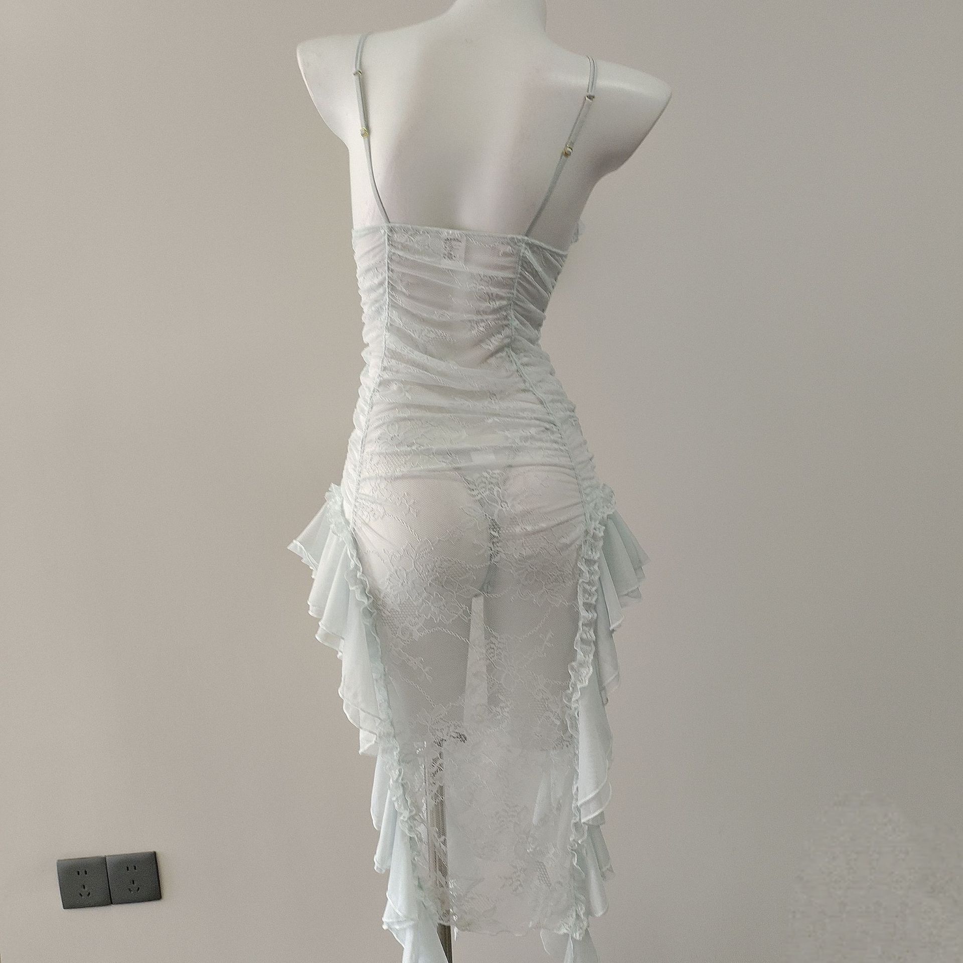 爆発的な背中のオープンフォーク快適パジャマ純色ネット糸透視誘惑露背サスペンダースカート下着ホーム服セット