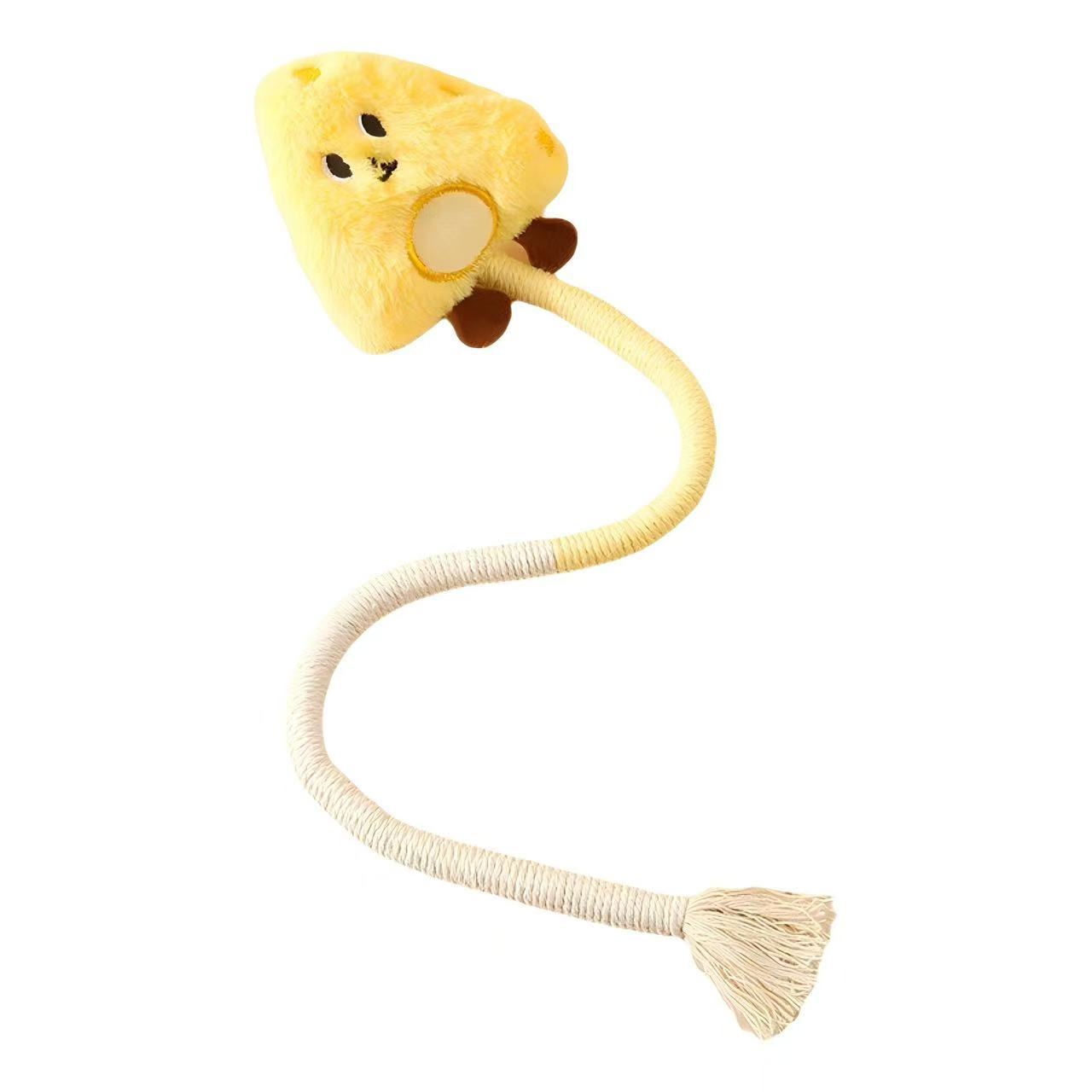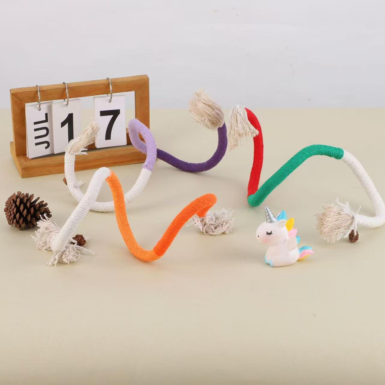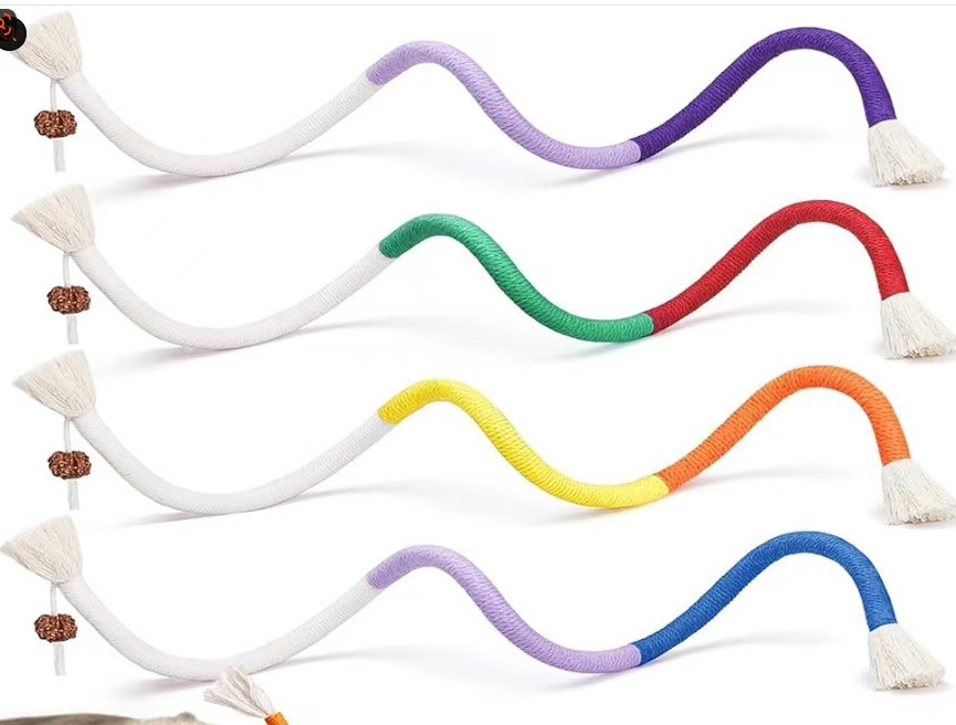 • 材质与设计:采用耐磨的绳材编织而成,搭配流苏和小铃铛(或类似发声小部件),从视觉、听觉上吸引猫咪注意力;有多种色彩搭配(如紫白、橙黄白、绿红白等),造型灵动,增加玩耍趣味性。