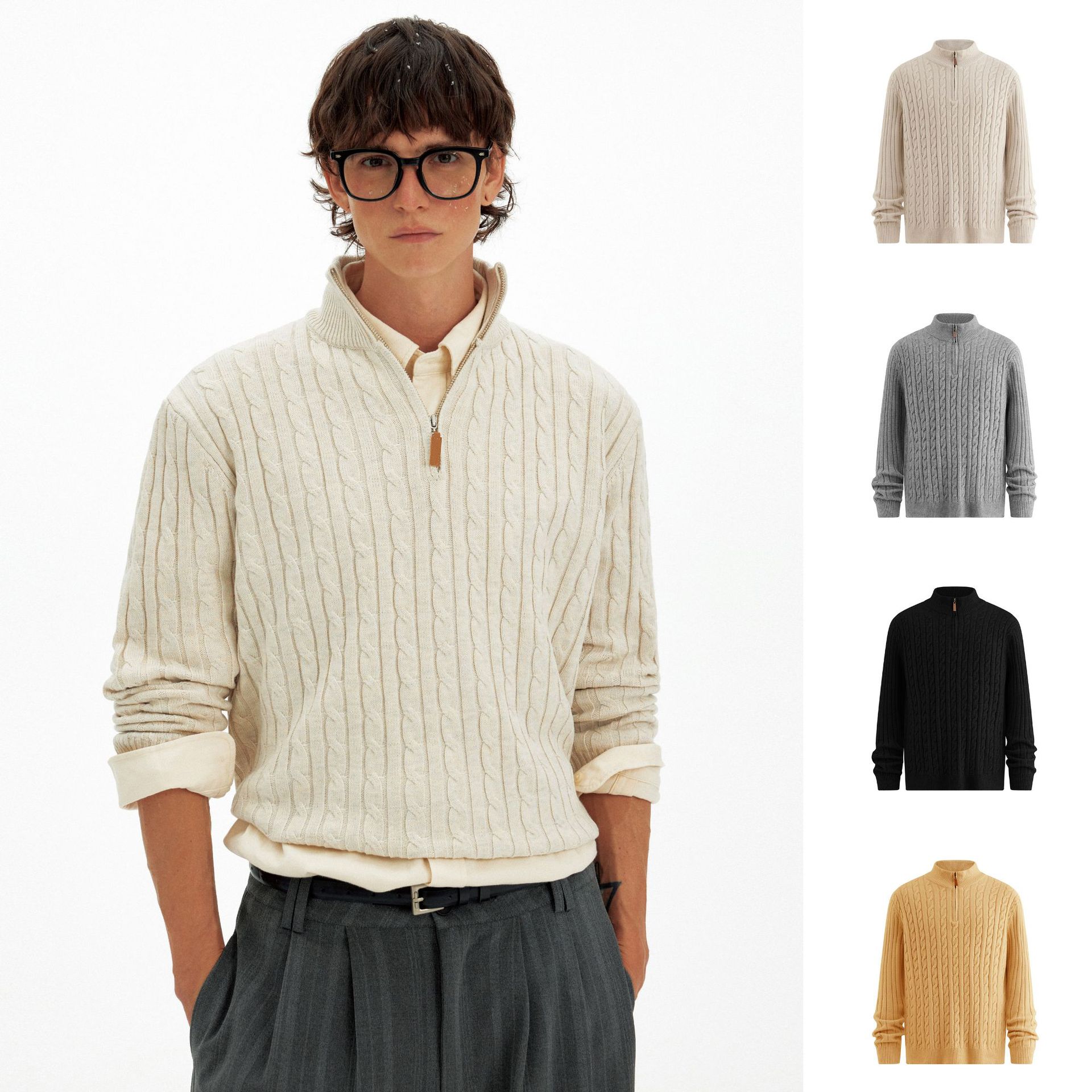 复古半拉链立领针织衫男麻花纹修身毛衣绞花纹老钱风复古针织衫男