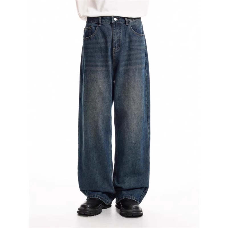 レトロジーンズメンズストレートレッグルーズワイドレッグウォッシュ加工アメリカンハイストリートパンツトレンディな多用途カジュアルパンツ