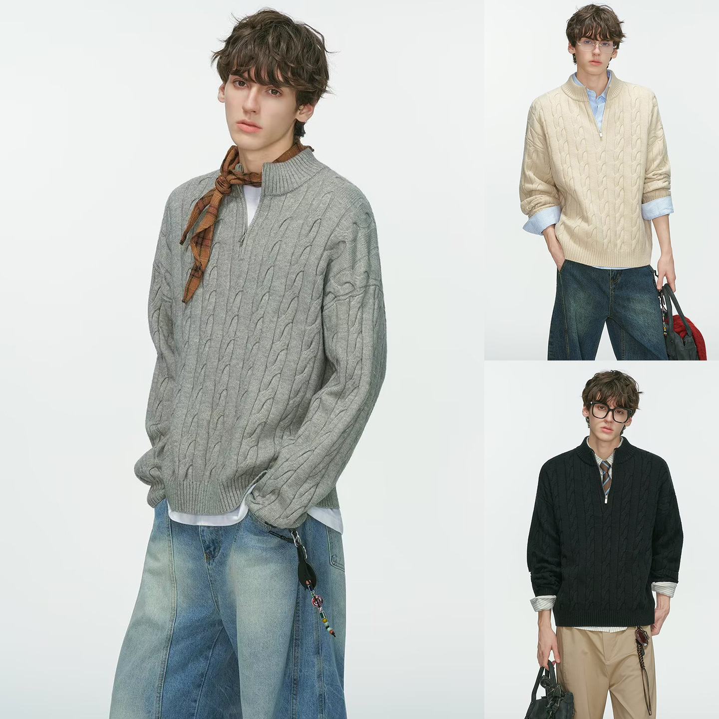 半拉链毛衣男慵懒风高级感美式复古麻花青少年男士内搭打底针织衫