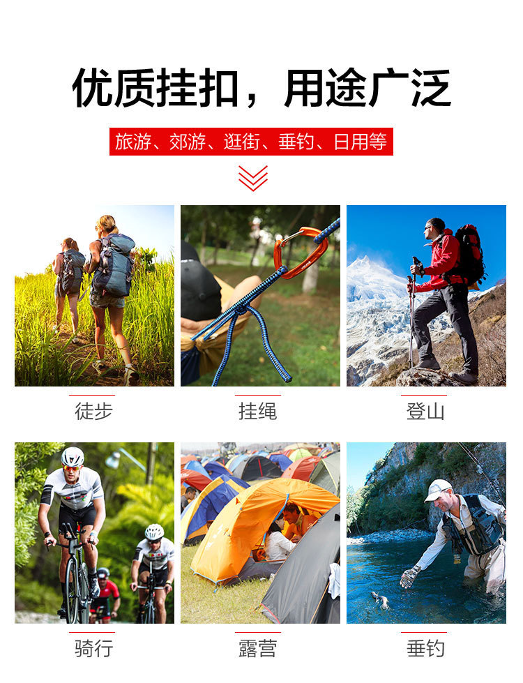 用途:背包快挂,水壶挂,帐篷快挂等户外运动
