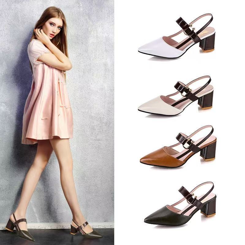 包头凉鞋女2025新款夏季简约尖头方跟凉鞋女高跟细带时装单鞋批发