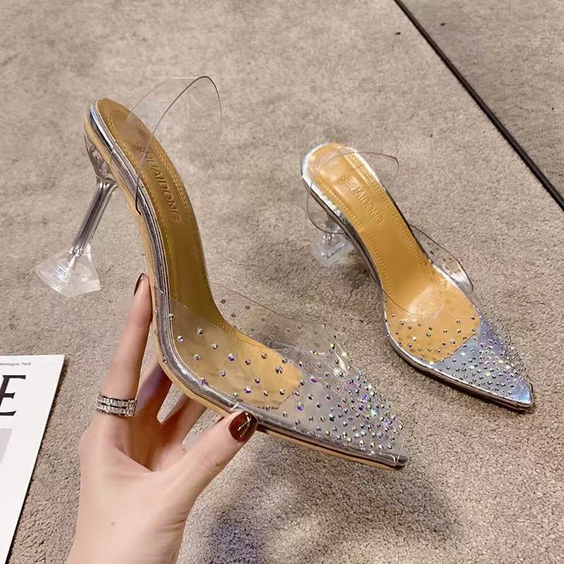 女性の夏クールクリスタル pu サイズヨーロッパとアメリカのハイヒールスリッパ新しいスタイル 2025 ラインストーン外国貿易透明