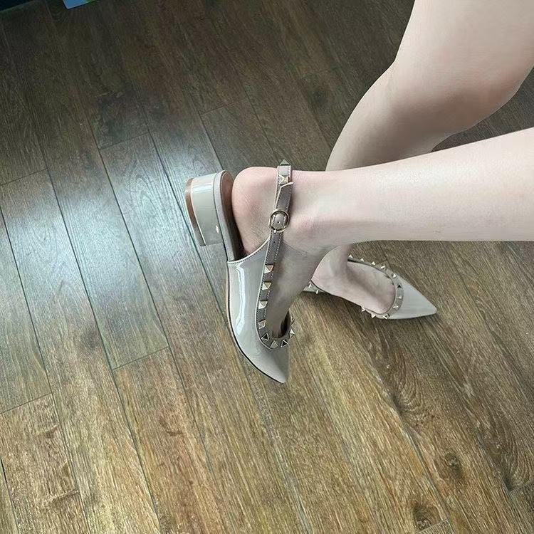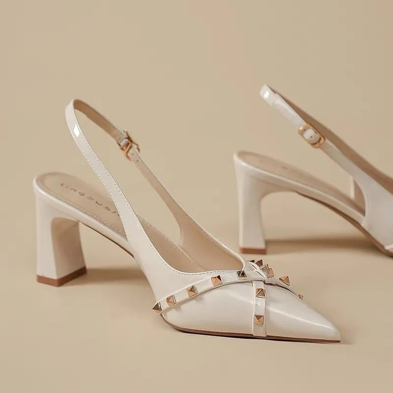 2025年新作包頭太ヒールレディースリベットフレンチフェアリースタイルシューズポインテッドトゥパテントレザー疲れにくいファッションサンダル