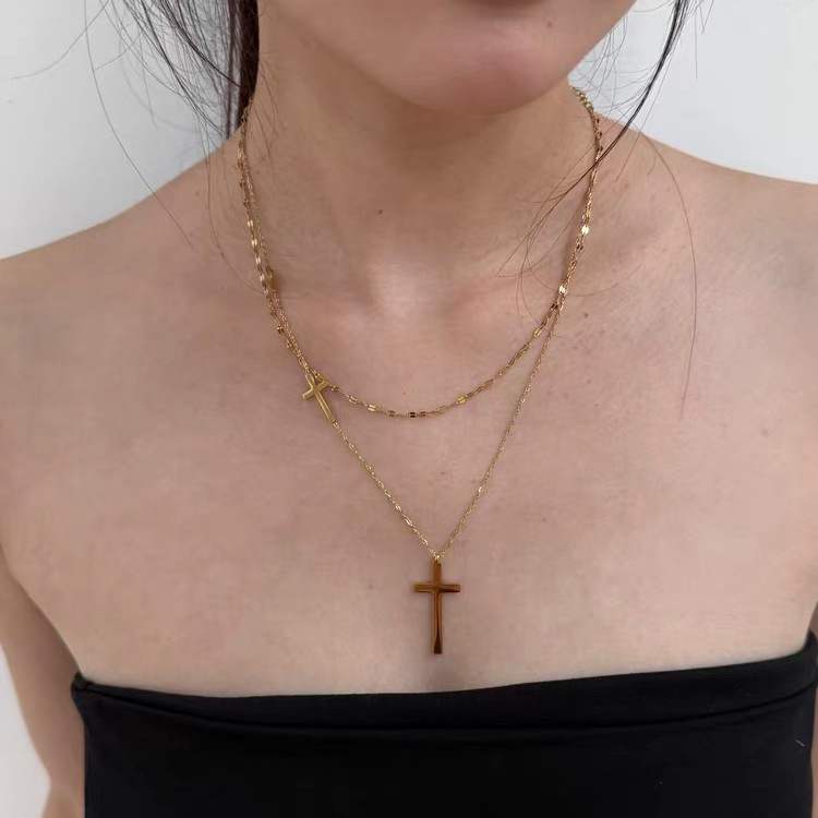 欧美风简约百搭双层金色十字架项链小众设计感高级感锁骨链颈链