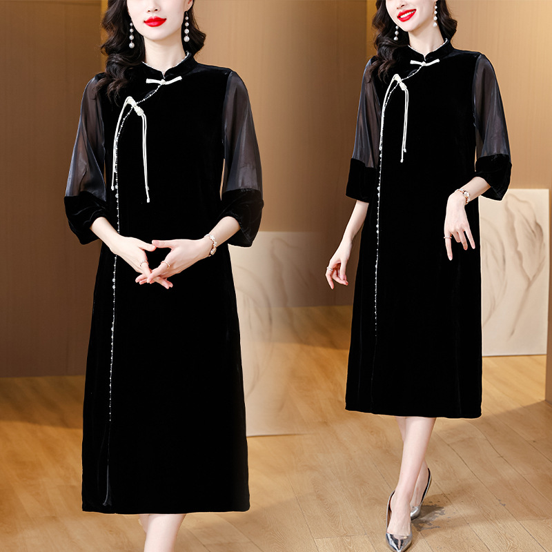 新中国式重工釘珠ベルベットワンピース女2024春新作レトロ国風盤ボタン立襟小黒スカート