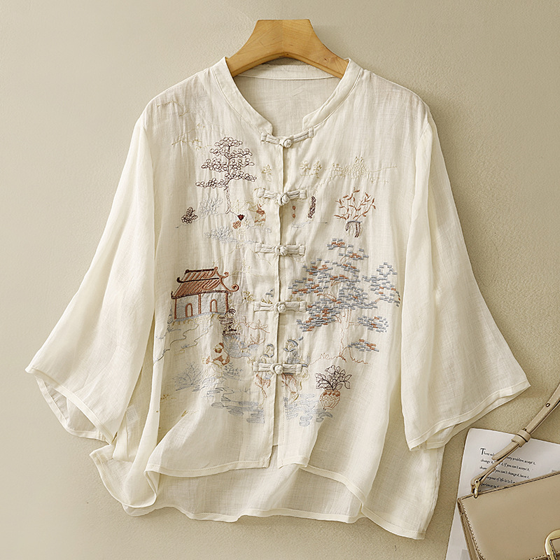 重工綿麻刺繍ゆるい百合シャツ2024夏の新型ファッションレトロ国風盤ボタン漢服上着