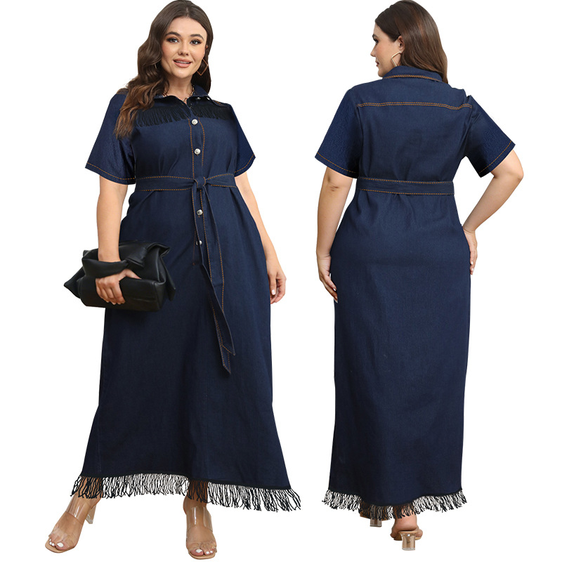 218602跨境大码女装牛仔翻领长袖绑带中长款连衣裙源头工厂直销
