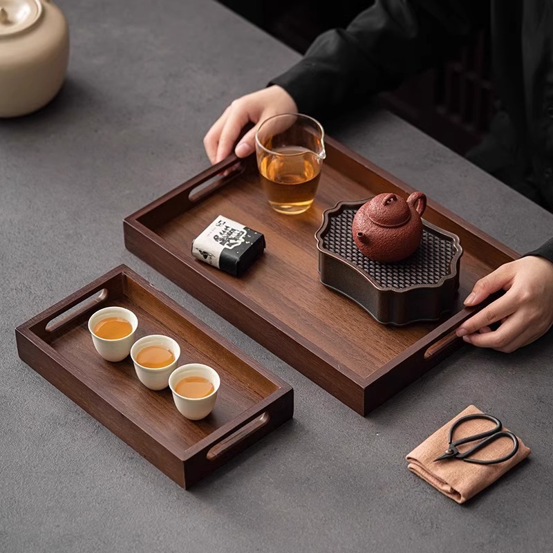 ウォールナットダークウォーターカップ収納ハンドル家庭用大型日本茶セットトレイ竹木製長方形ハンドルディスプレイトレイ