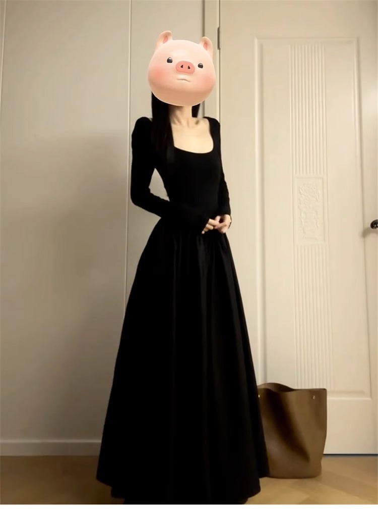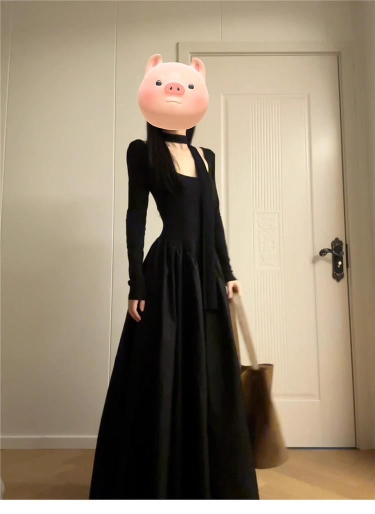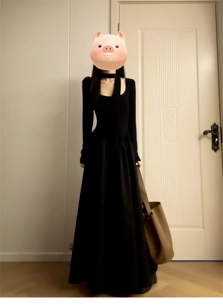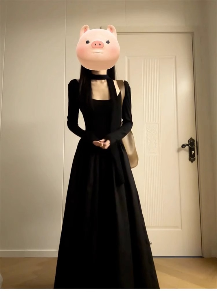法式气质包臀长裙黑色长袖连衣裙子2025新款深秋初冬季内搭打底女