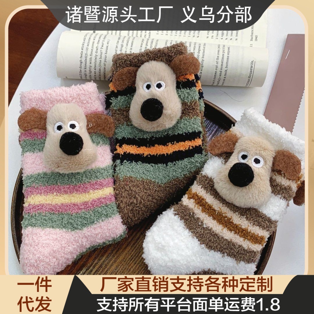 百搭加厚加绒睡眠袜毛绒保暖中筒袜小狗珊瑚绒袜子女款秋冬地板袜