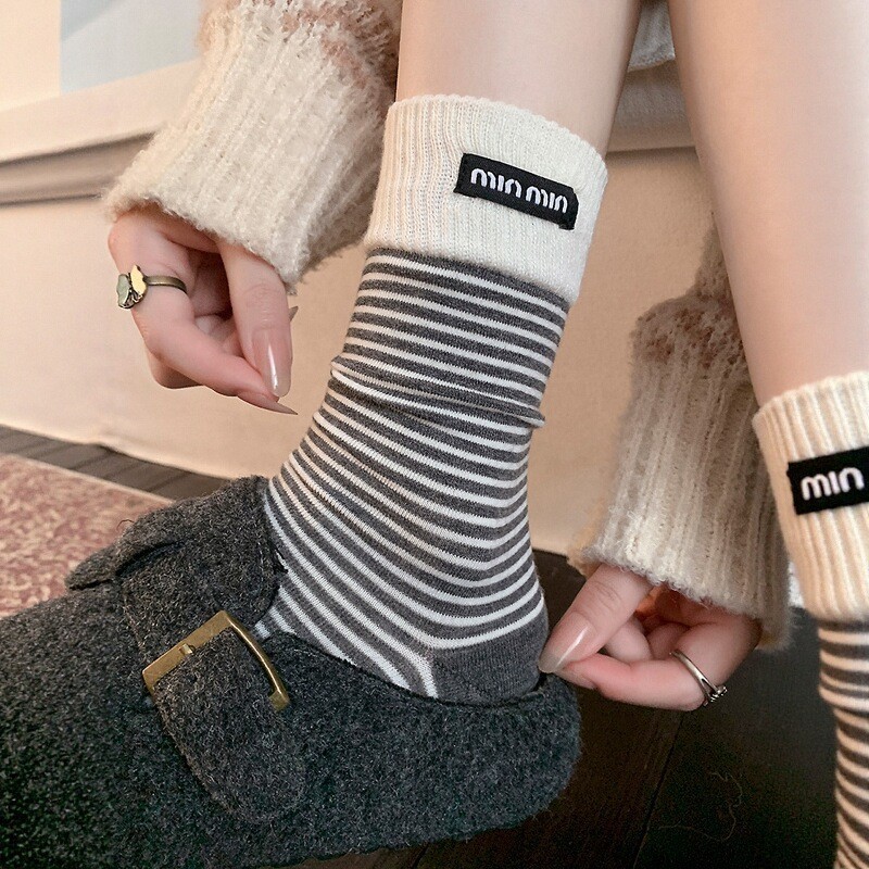 miu系布标条纹小腿袜子男女拼色百搭中筒堆堆袜小众软糯不扎棉袜