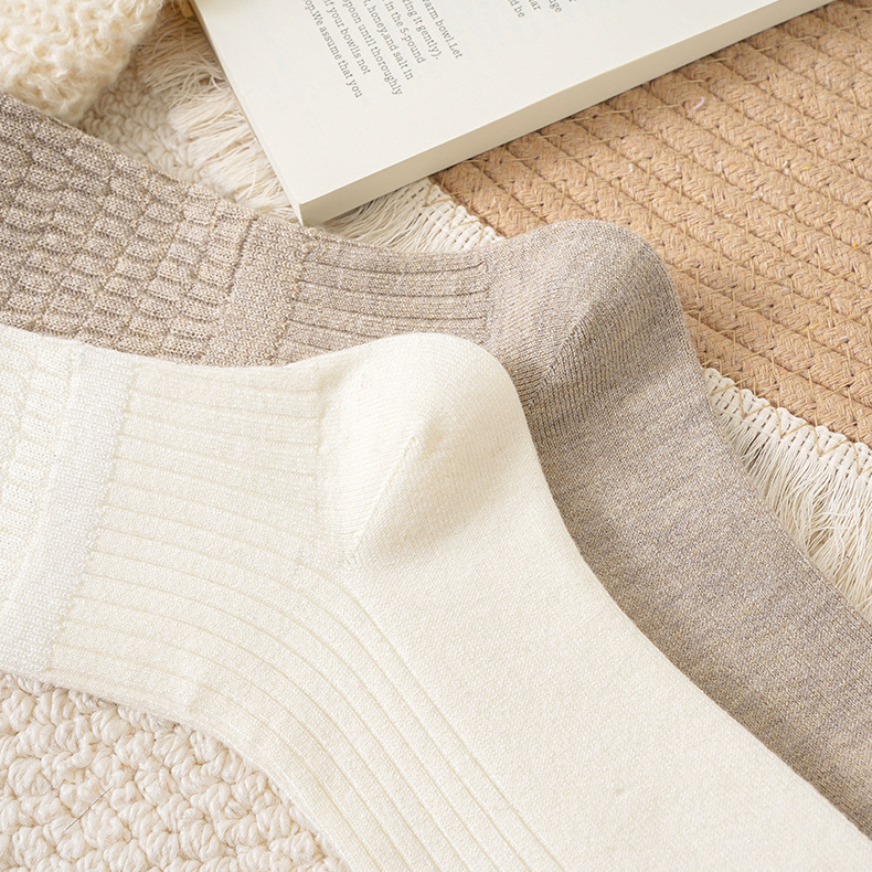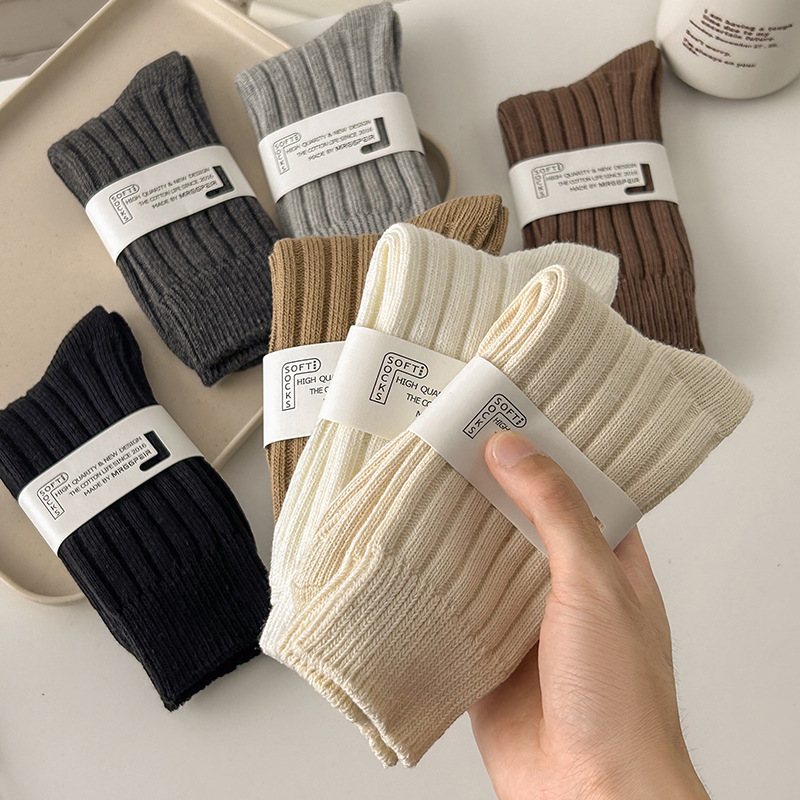 新しい女性の双針の靴下のカジュアルな純色の中筒の綿の靴下の秋冬の厚い金の保温の精密な綿の日本の女性の靴下