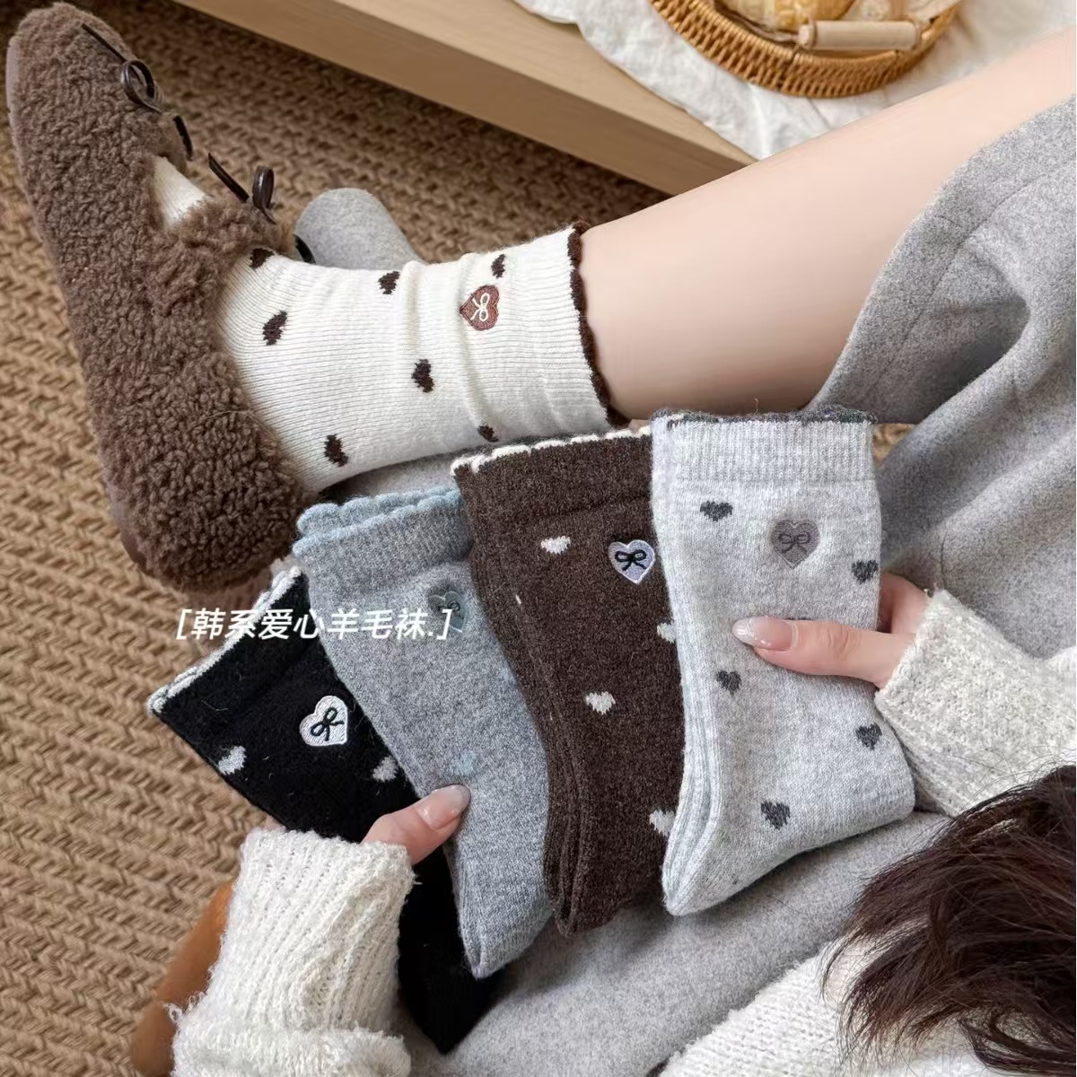 韩系爱心羊毛袜女日系刺绣蝴蝶结女士羊毛中筒袜学院风外穿百搭潮