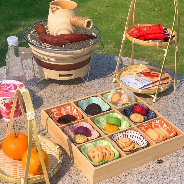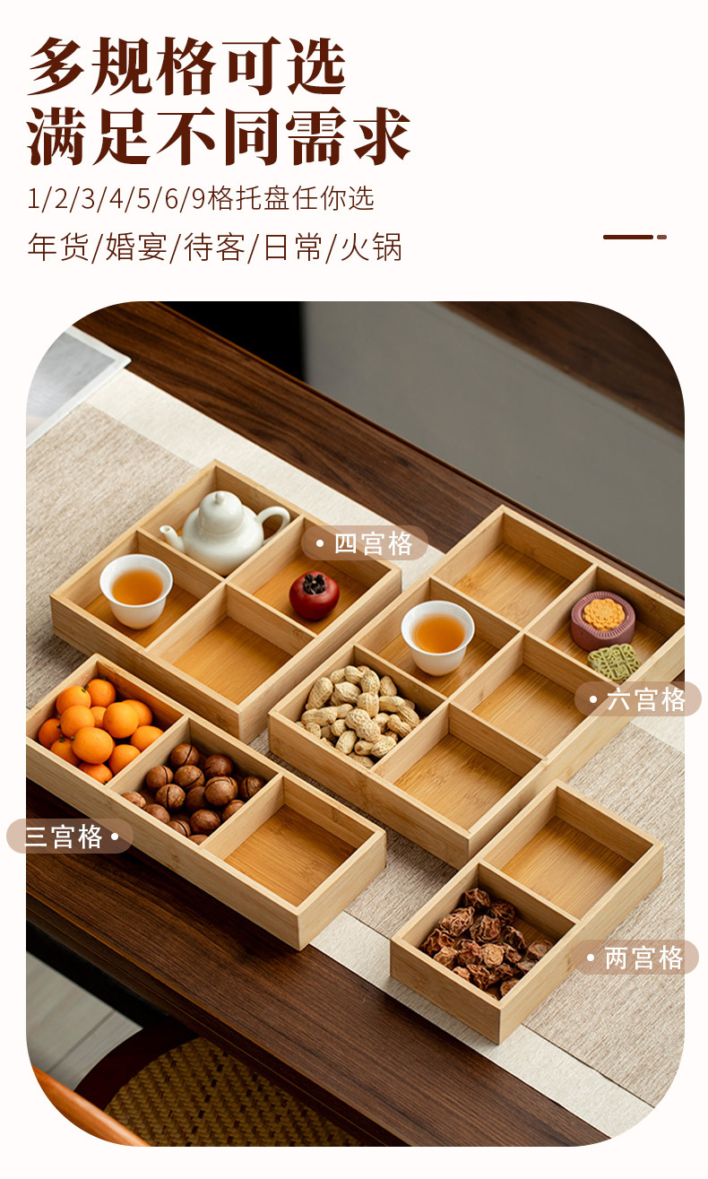 竹プレート、格子縞のディナープレート、フルーツ食器、盛り合わせ、スナック、おかず、木製トレイ、九方格子、軽食、鍋、ドライフルーツプレート