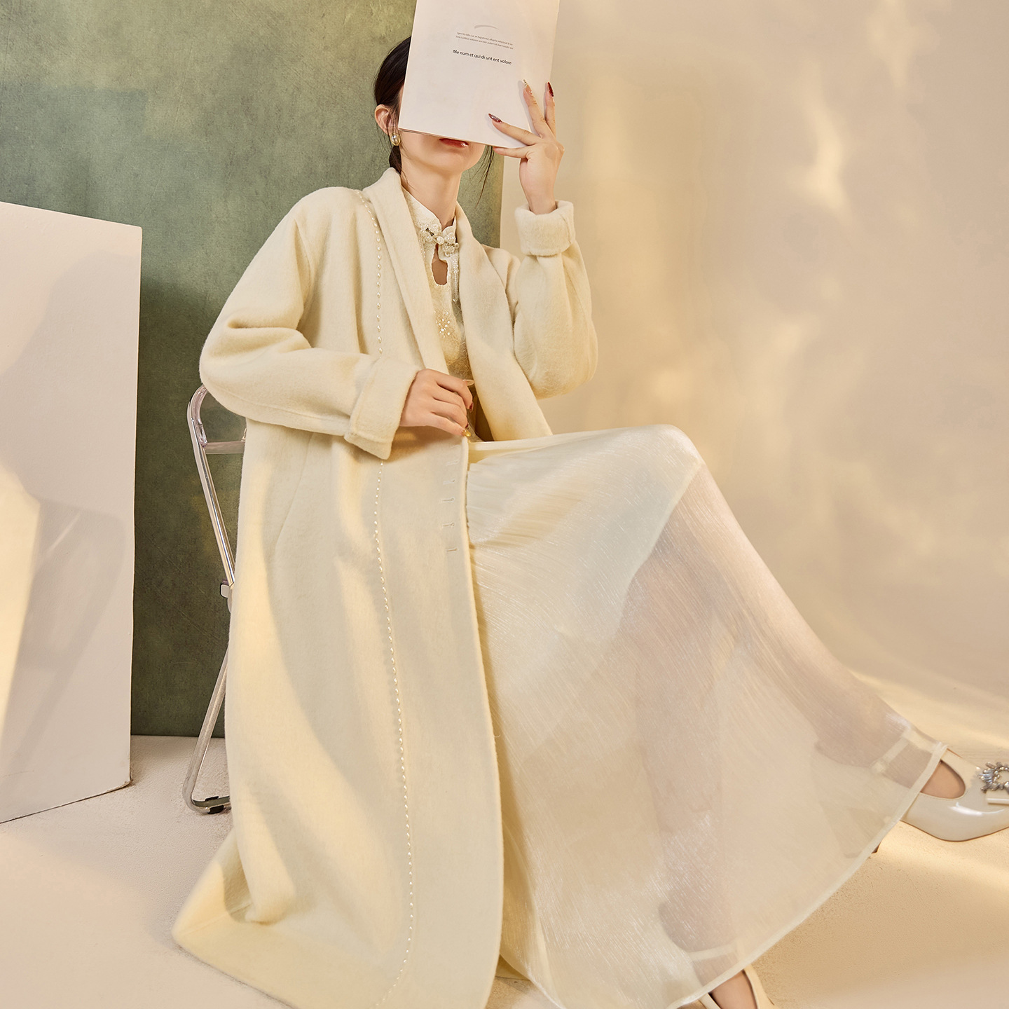 冬季新中式双面呢钉珠大衣女装新品宽松休闲气质毛呢外套女 NY024