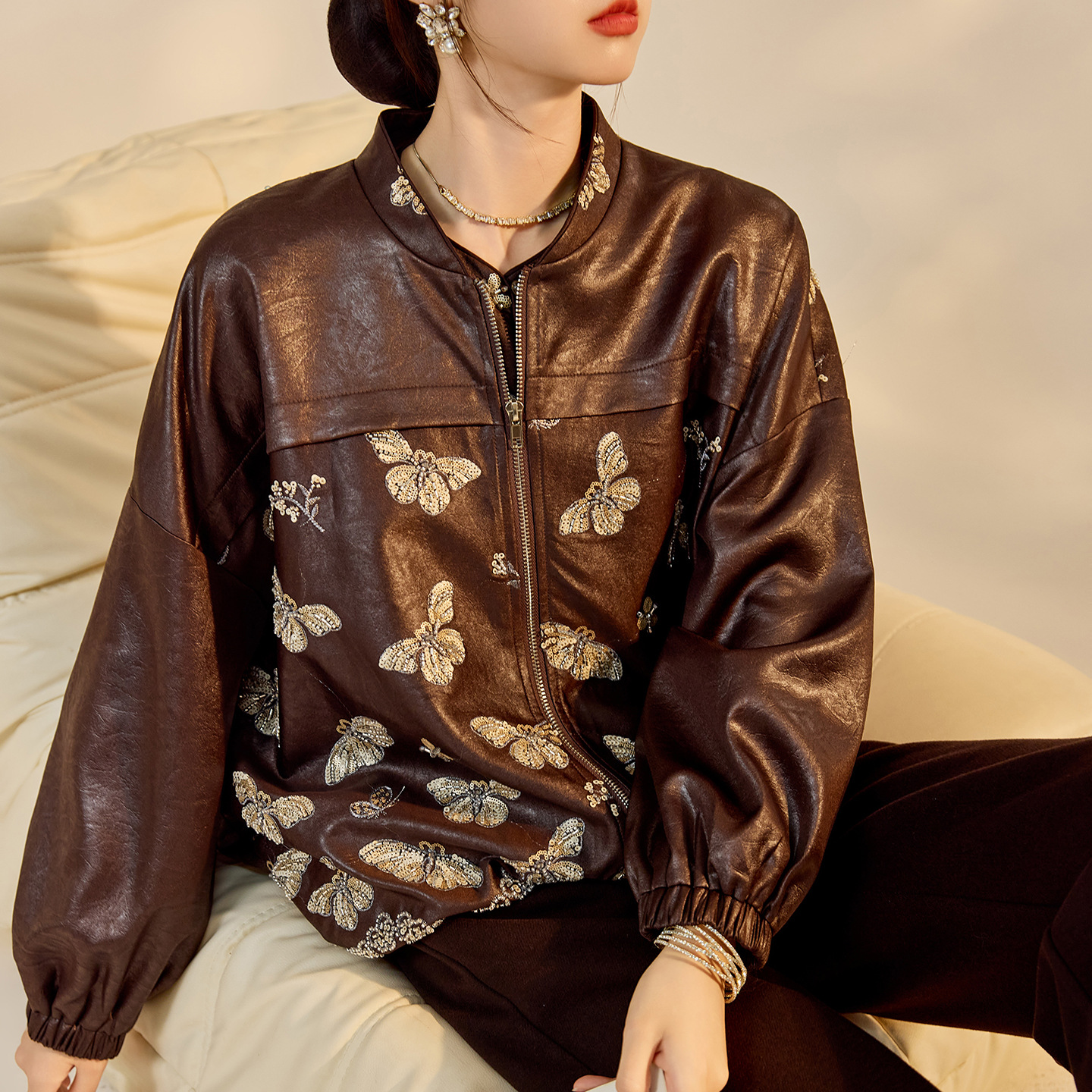新中国風サテンの花のスパンコールジャケットの純色の軽い贅沢な雰囲気がゆったりしていて、着痩せしている上着m1609
