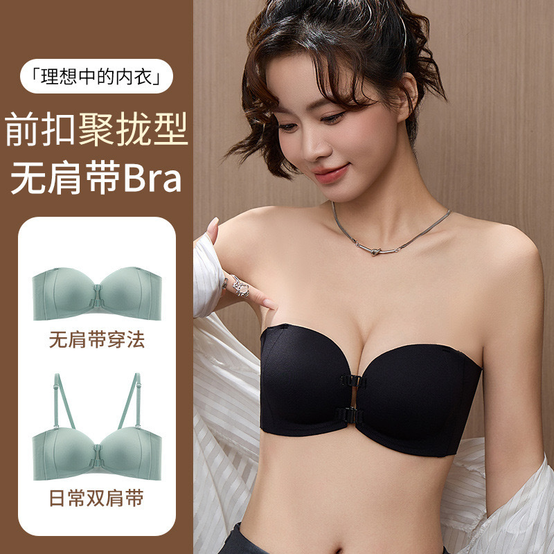 夏の肩ひものない下着のない女性のスチールリングが前に集まって薄い下の厚い光沢のある快適なブラジャーを掛けます。