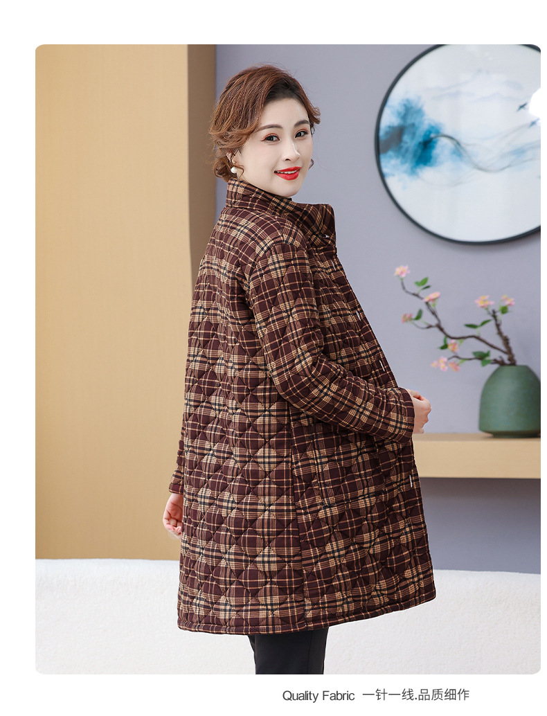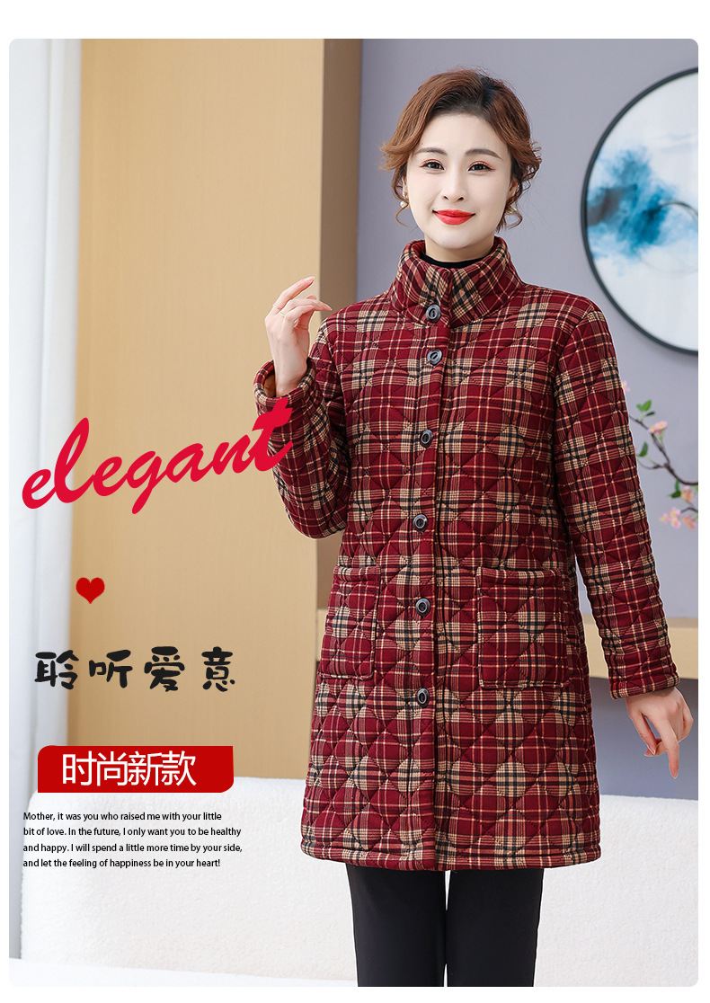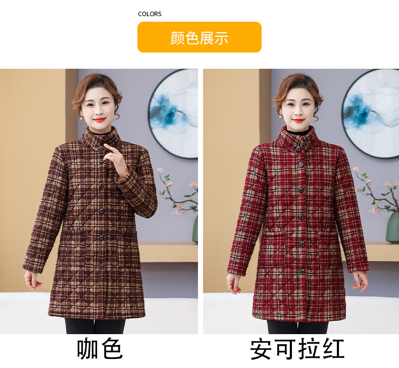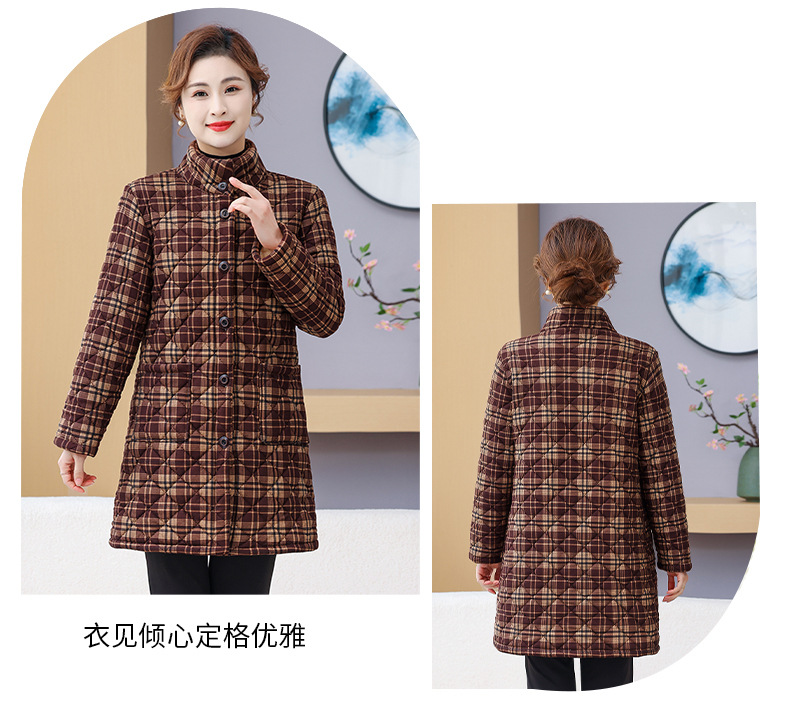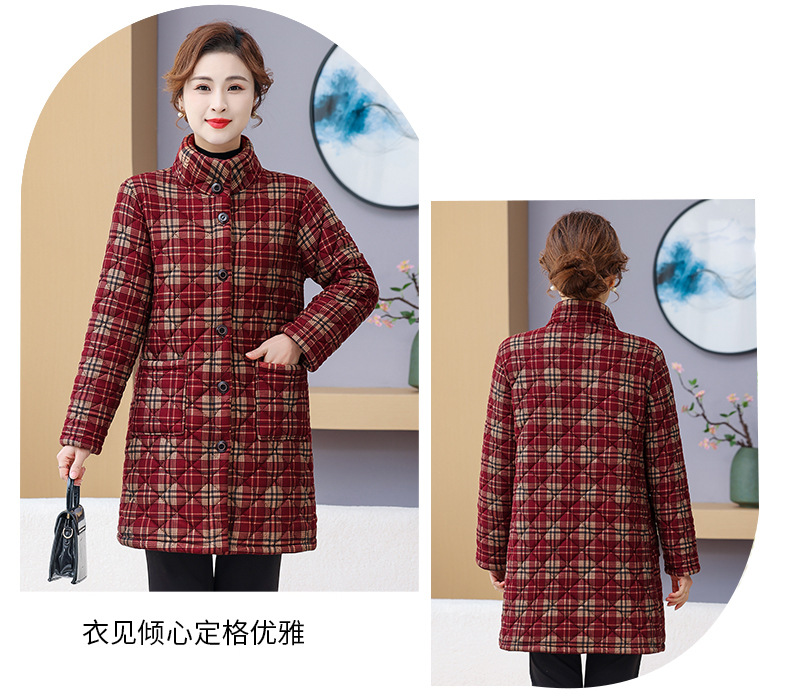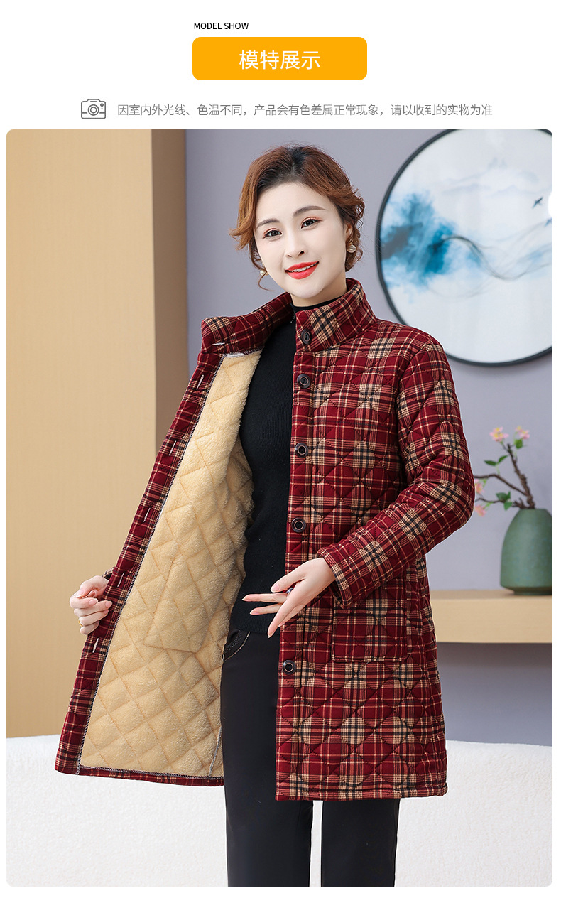 新款加绒大码中长款棉衣冬季棉服妈妈立领保暖加厚格子棉袄外套女