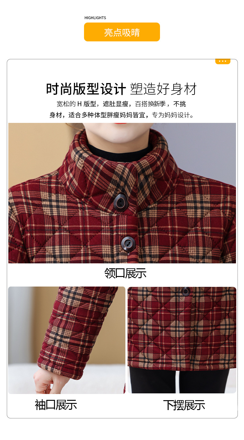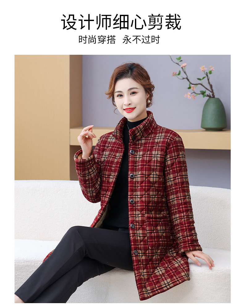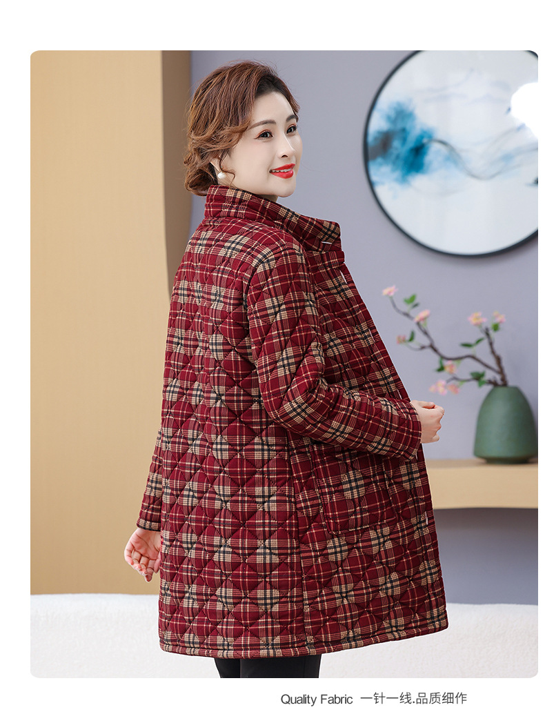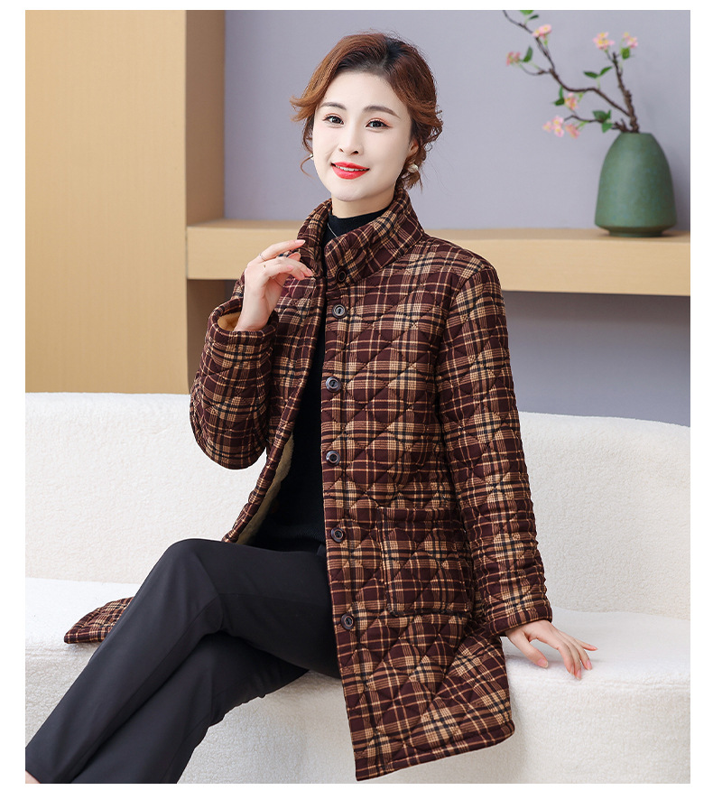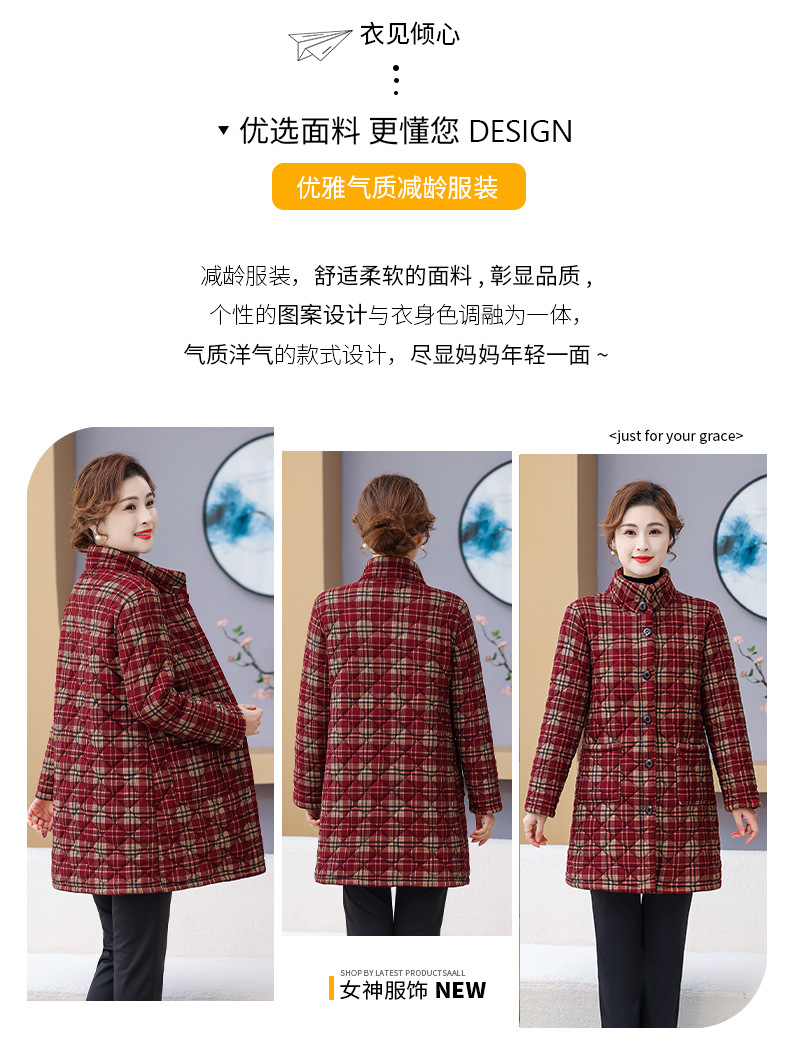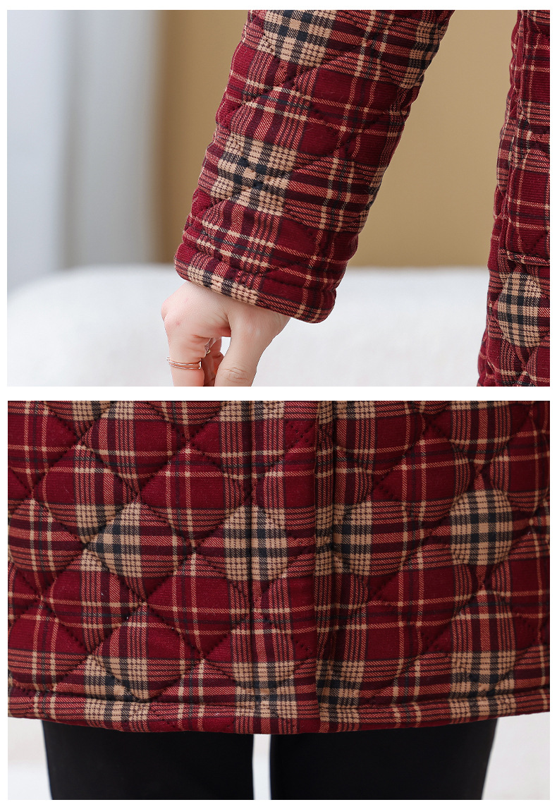 新款加绒大码中长款棉衣冬季棉服妈妈立领保暖加厚格子棉袄外套女