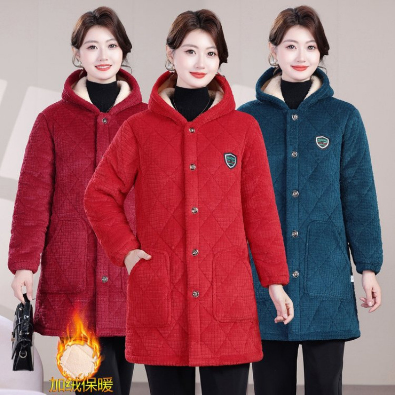 加绒加厚冬女士新年罩衣女外穿中老年保暖三层宽松中长款连帽棉服