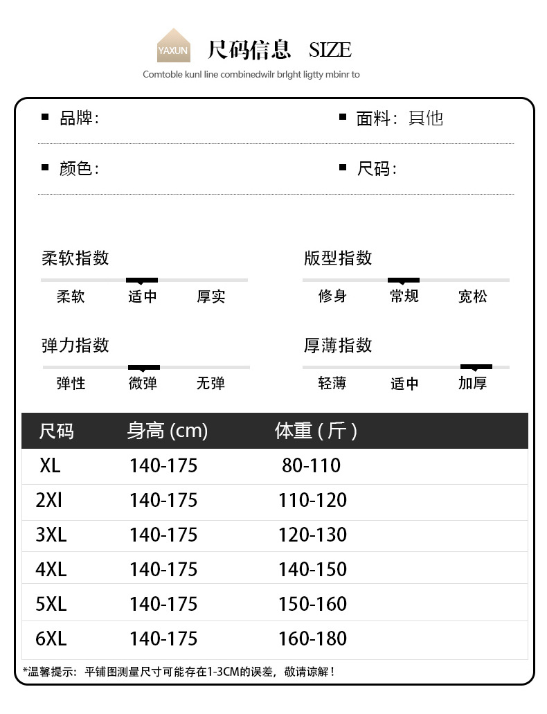 尺码 1XL【建议80-100斤】,2XL【建议105-120斤】,3XL【建议125-135斤】,4XL【建议135-145斤】,5XL【建议150-160斤】,6XL【建议160-165斤】