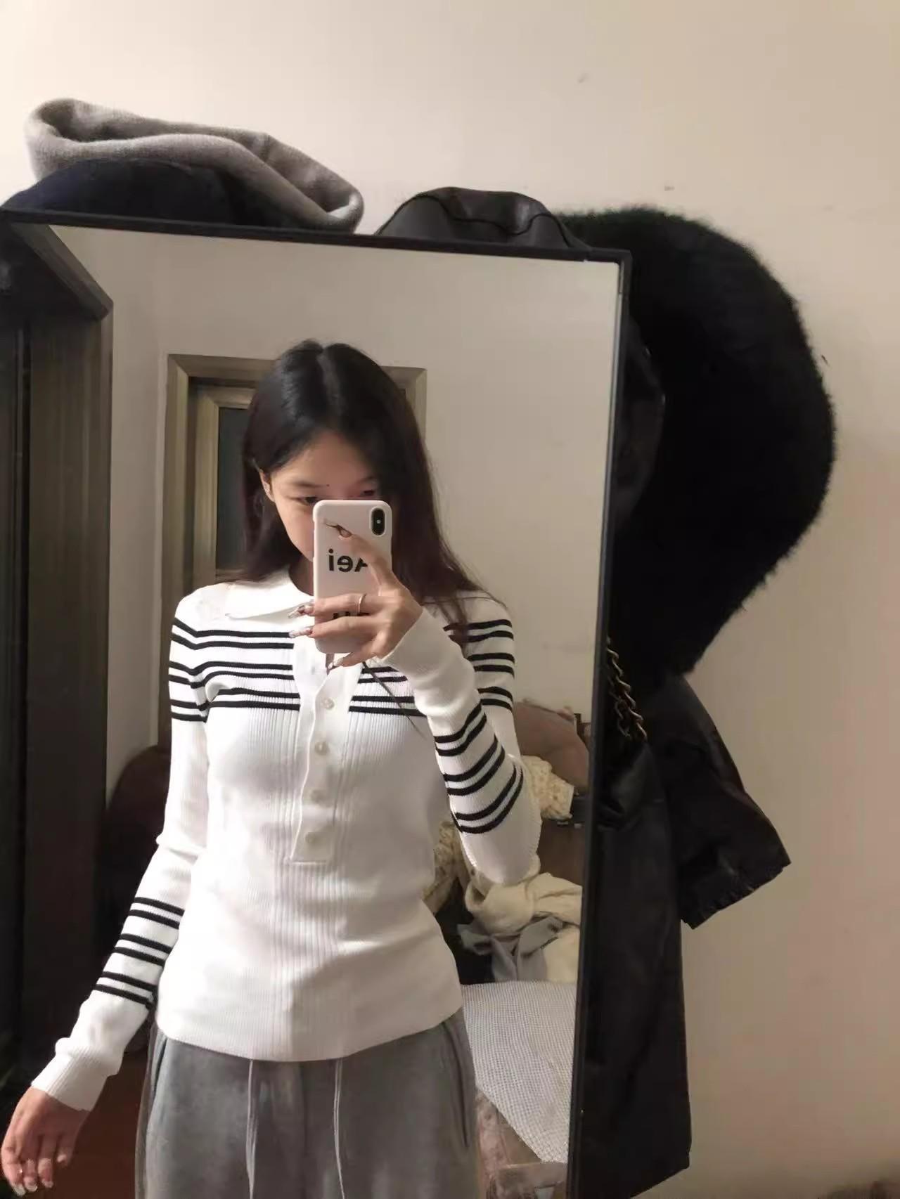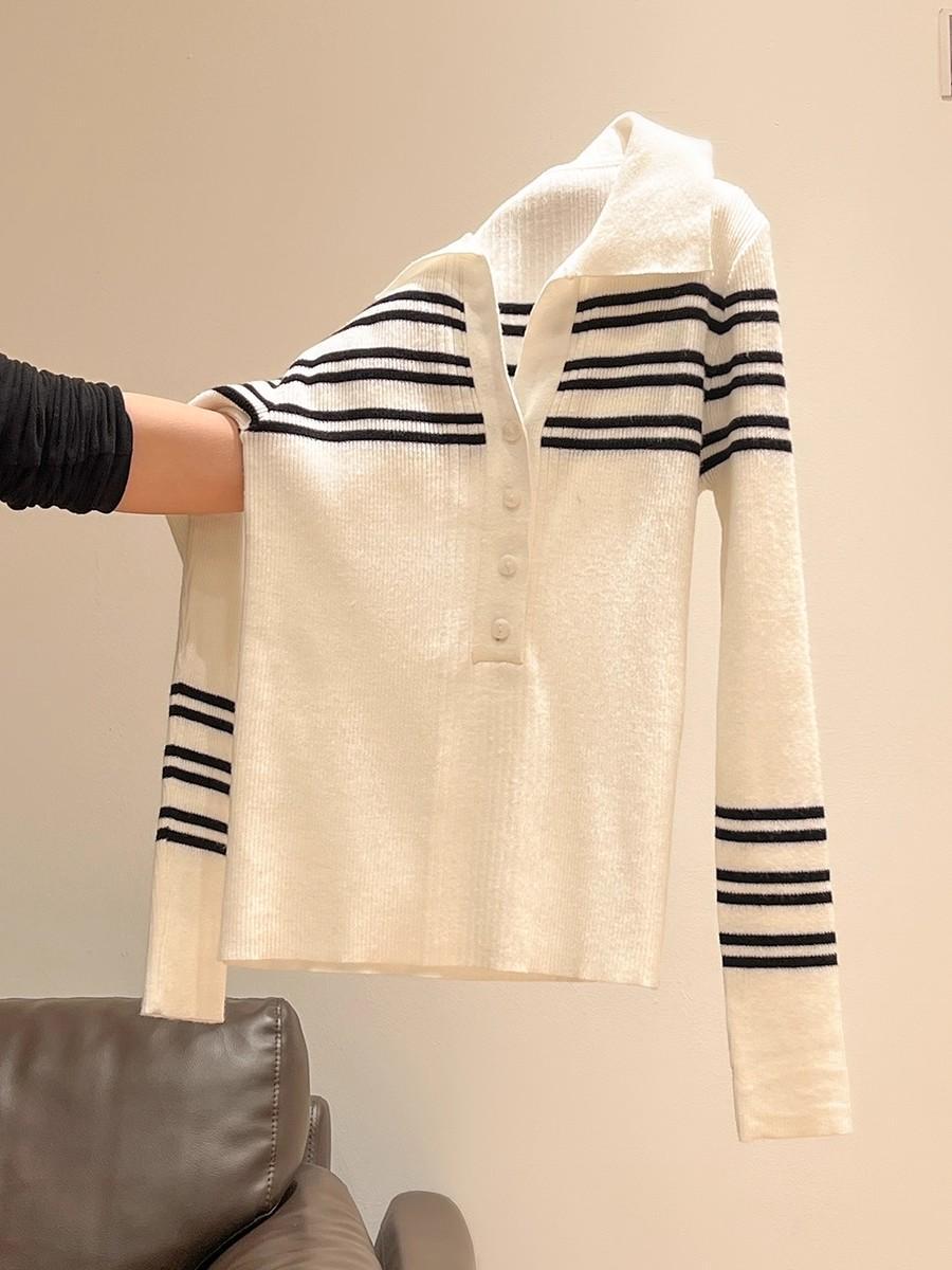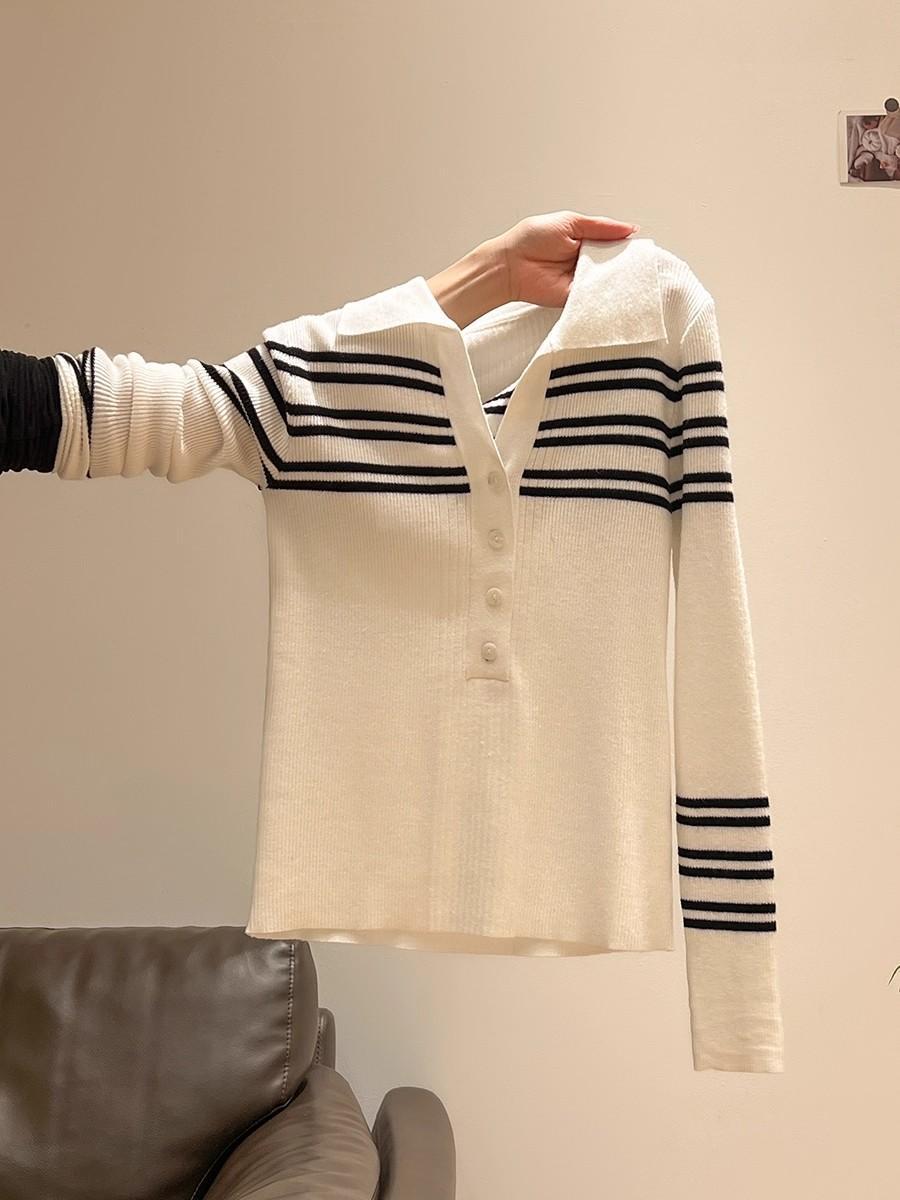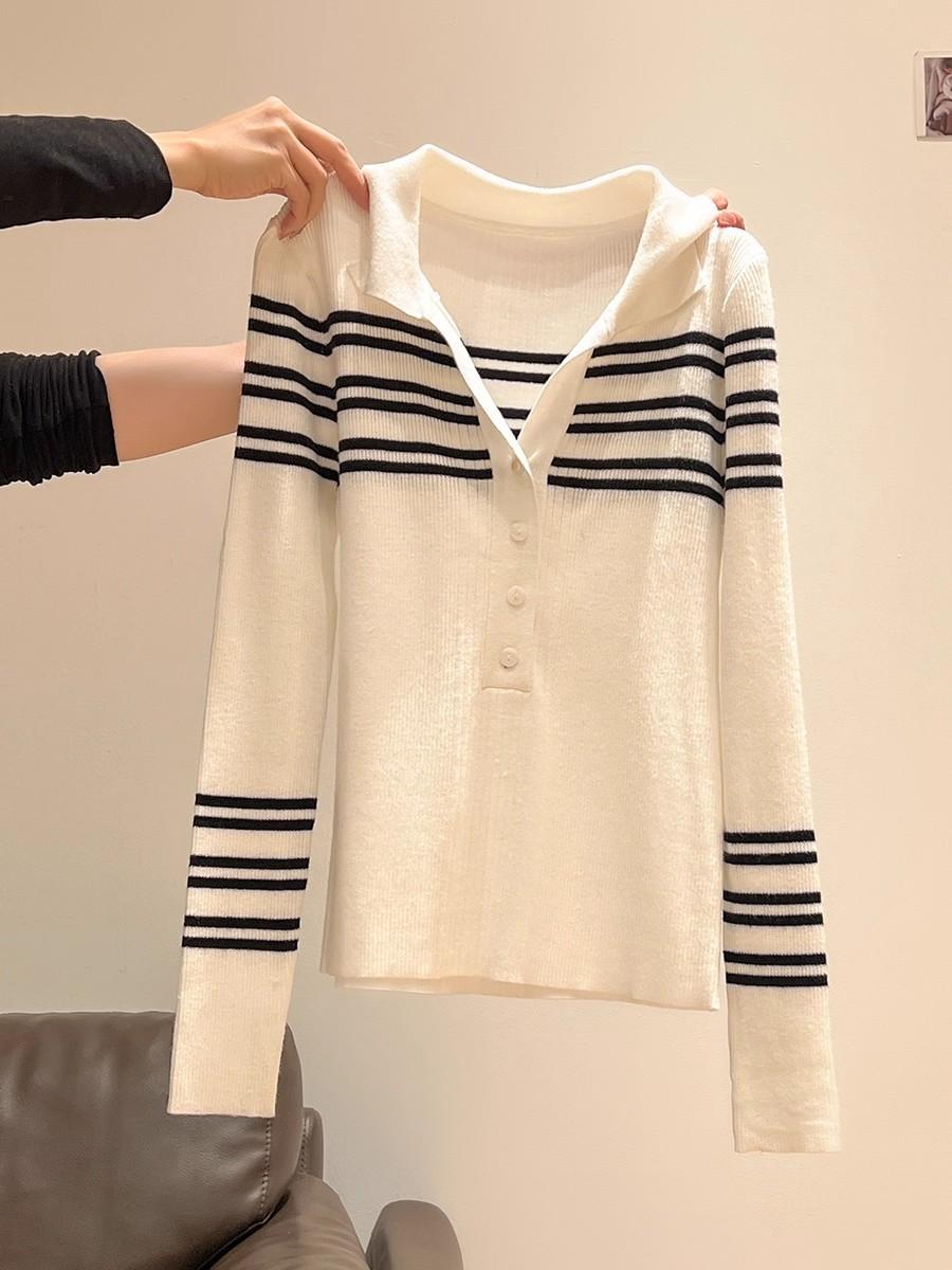 高级感条纹针织打底衫女早春款洋气内搭polo衫超好看显瘦V领上衣