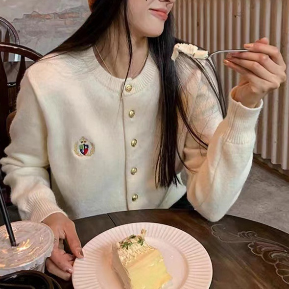 Zhao Lusi の同じスタイルのソリッドカラーの刺繍ツイストラウンドネックセーター女性のための 2025 春シングルブレストジャケットトップ