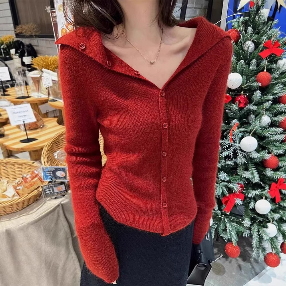 法式气质长袖针织衫2026洋气修身复古显瘦早春打底衫领红色毛衣女