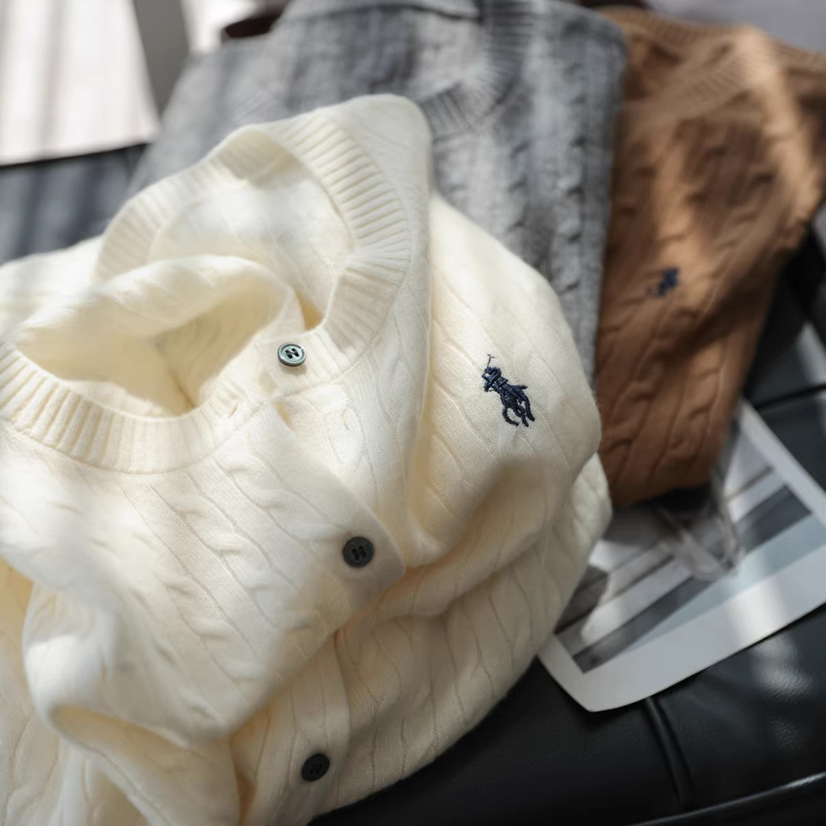 加厚老钱风小马刺绣麻花针织开衫女秋冬早秋复古圆领白色毛衣外套