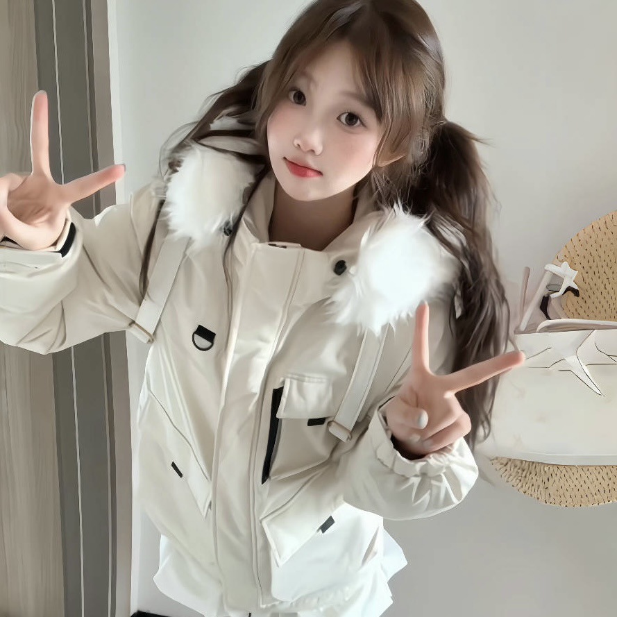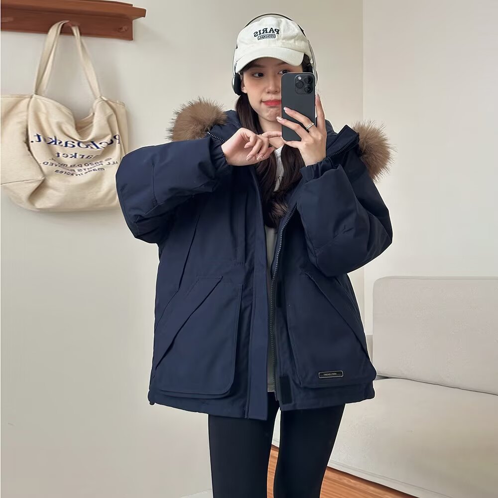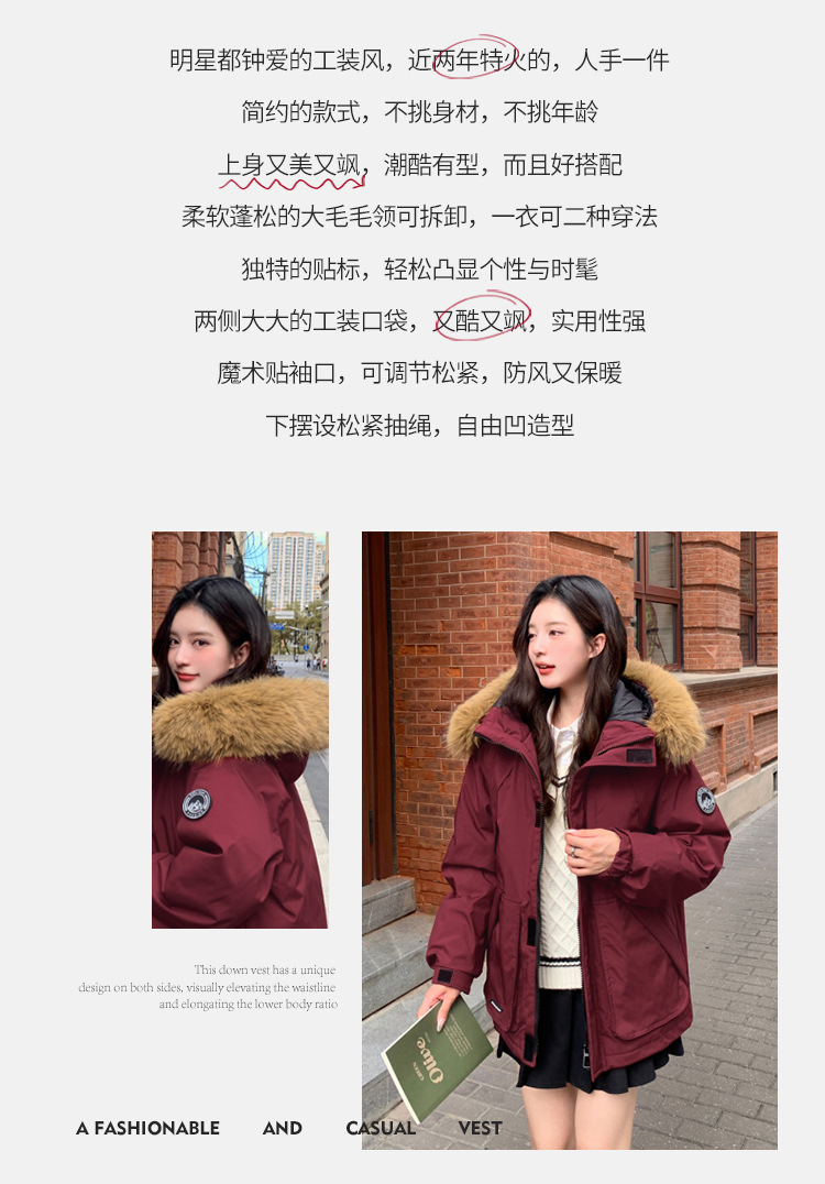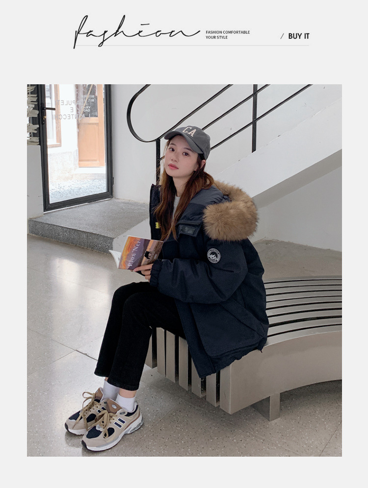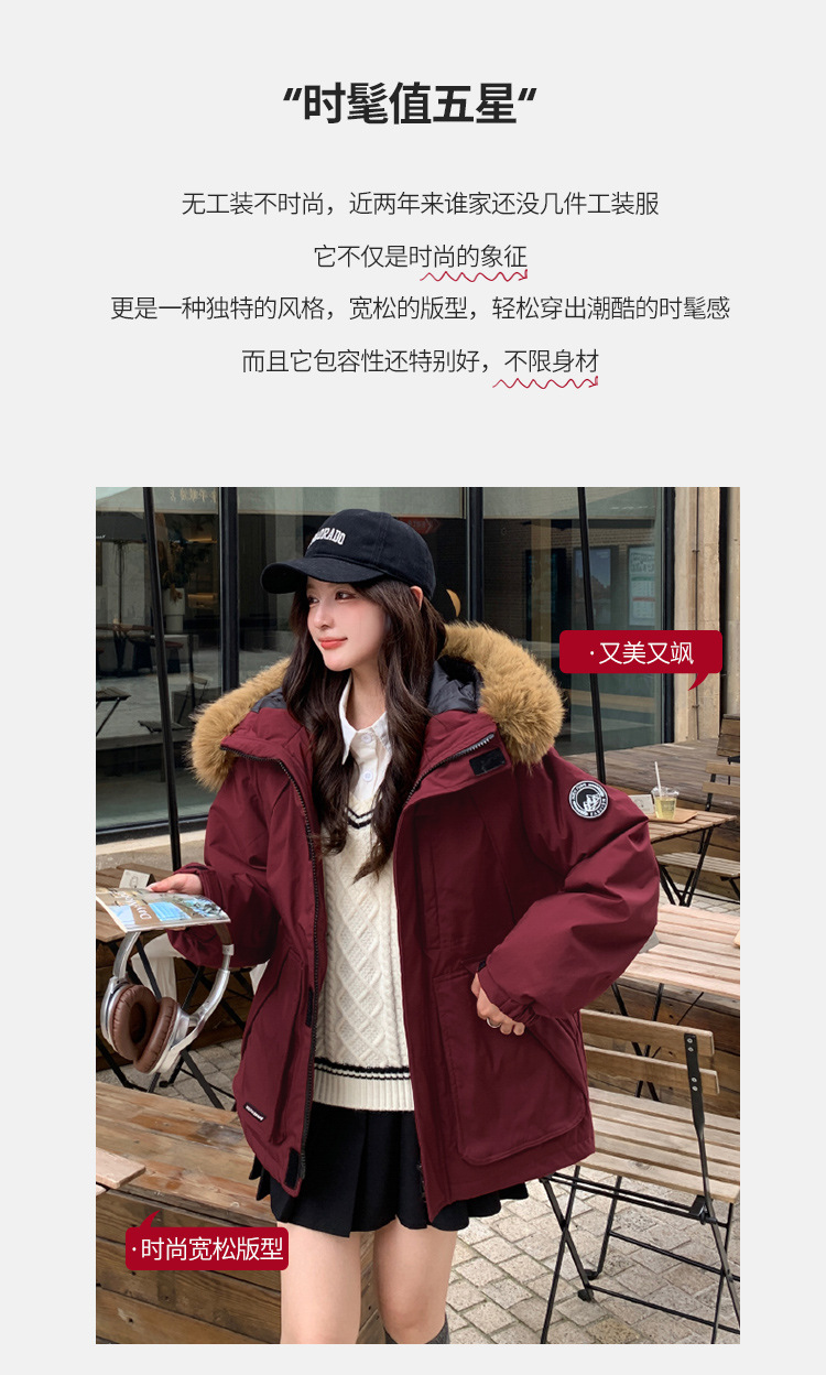 2025年冬季新款美式工装外套女学生加厚百搭派克服连帽毛领棉服潮