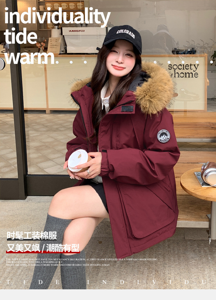2025新款工装棉服女冬季保暖连帽防风棉袄大毛领宽松加厚时尚外套