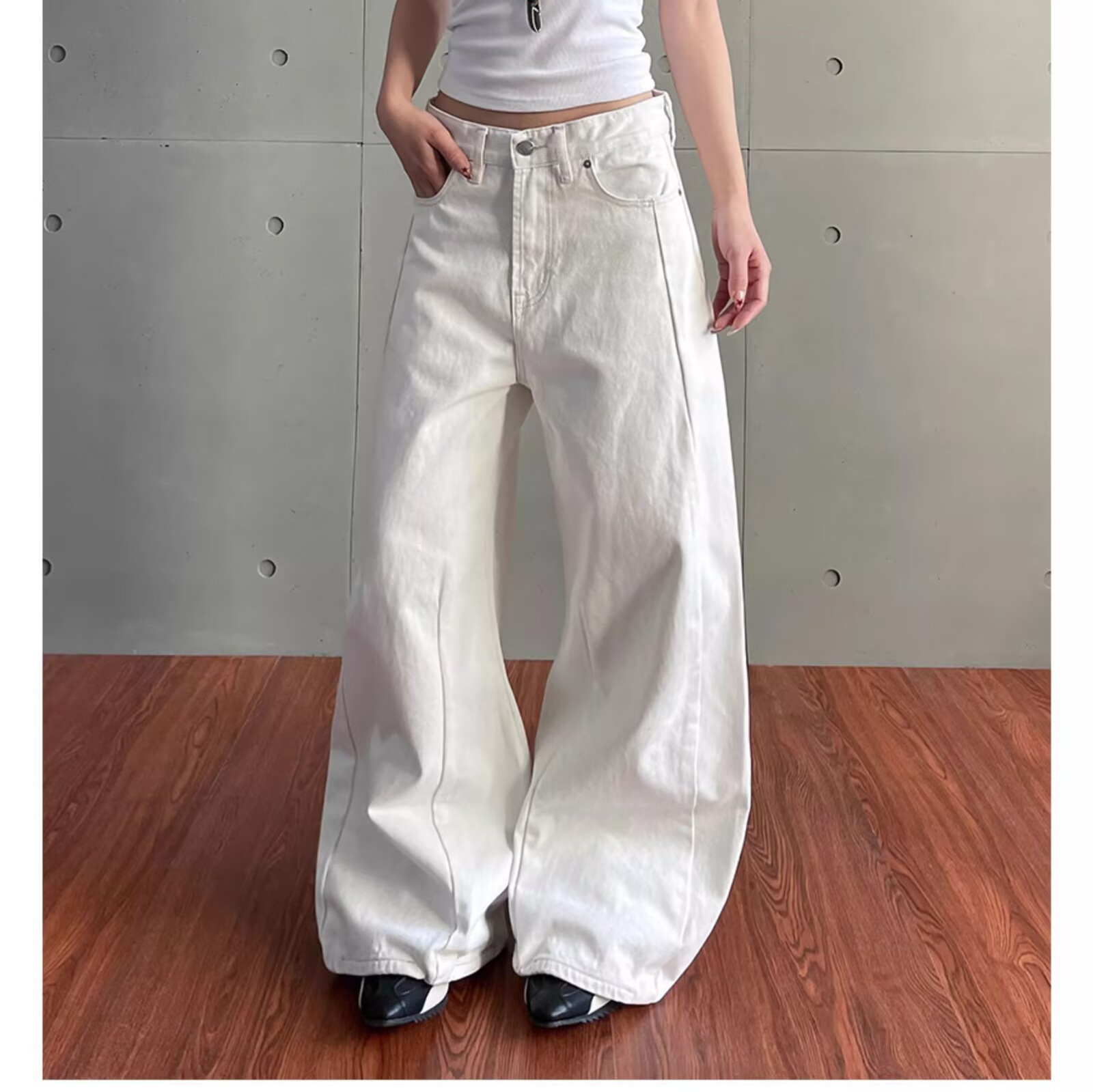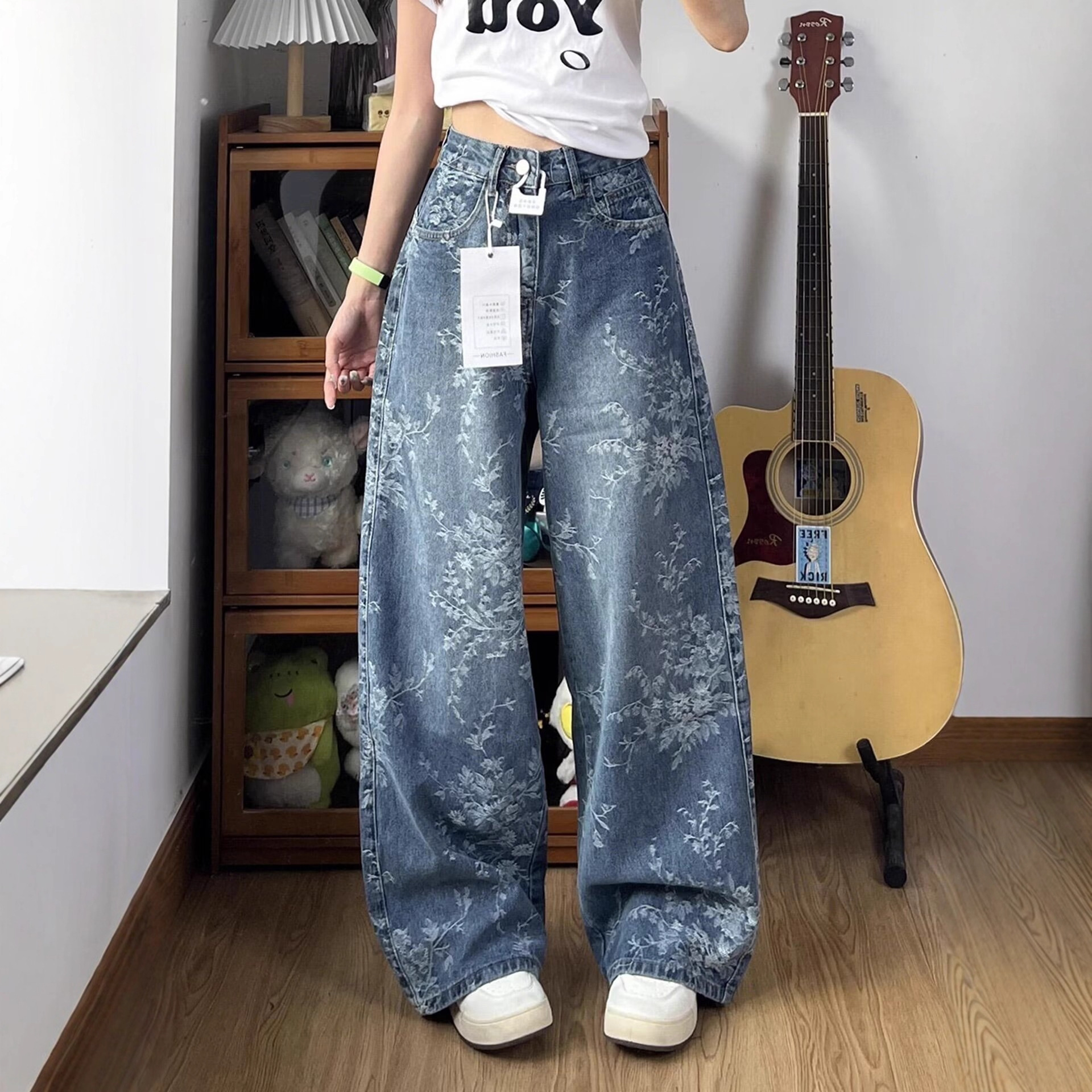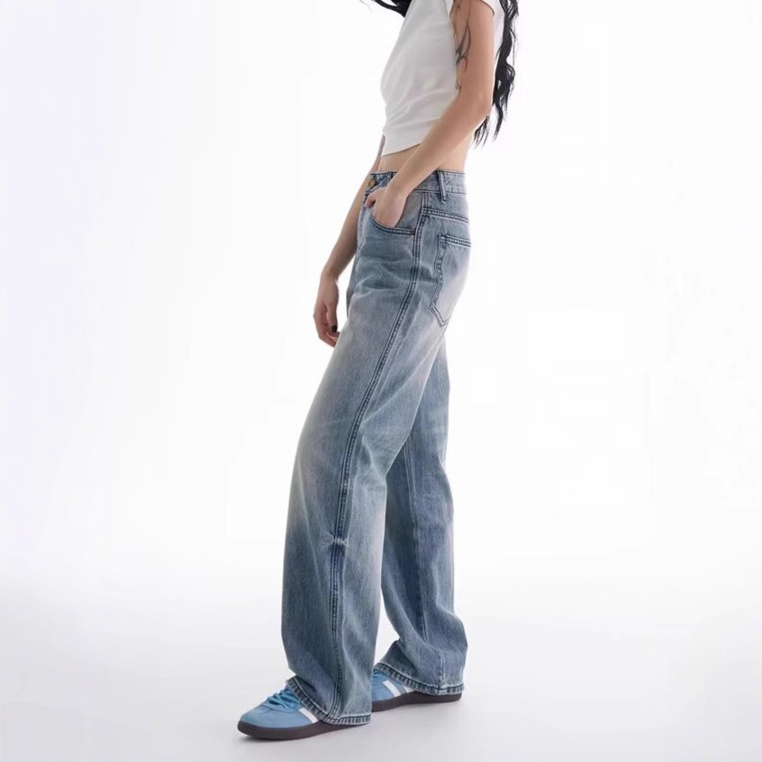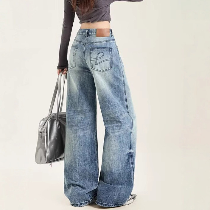 クロスボーダートレンド卸売レトロノスタルジックブルーウォッシュジーンズミッドローウエストストレートレッグワイドレッグフロアレングスパンツ