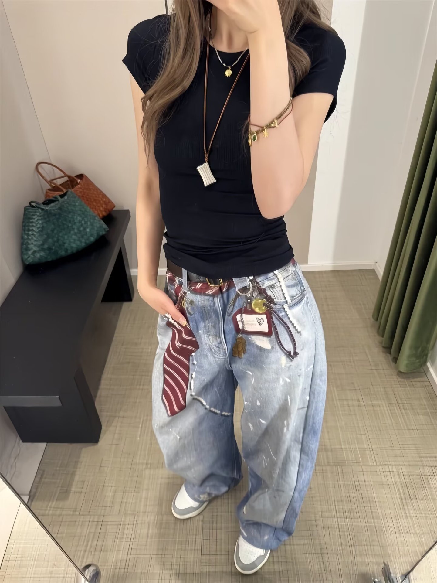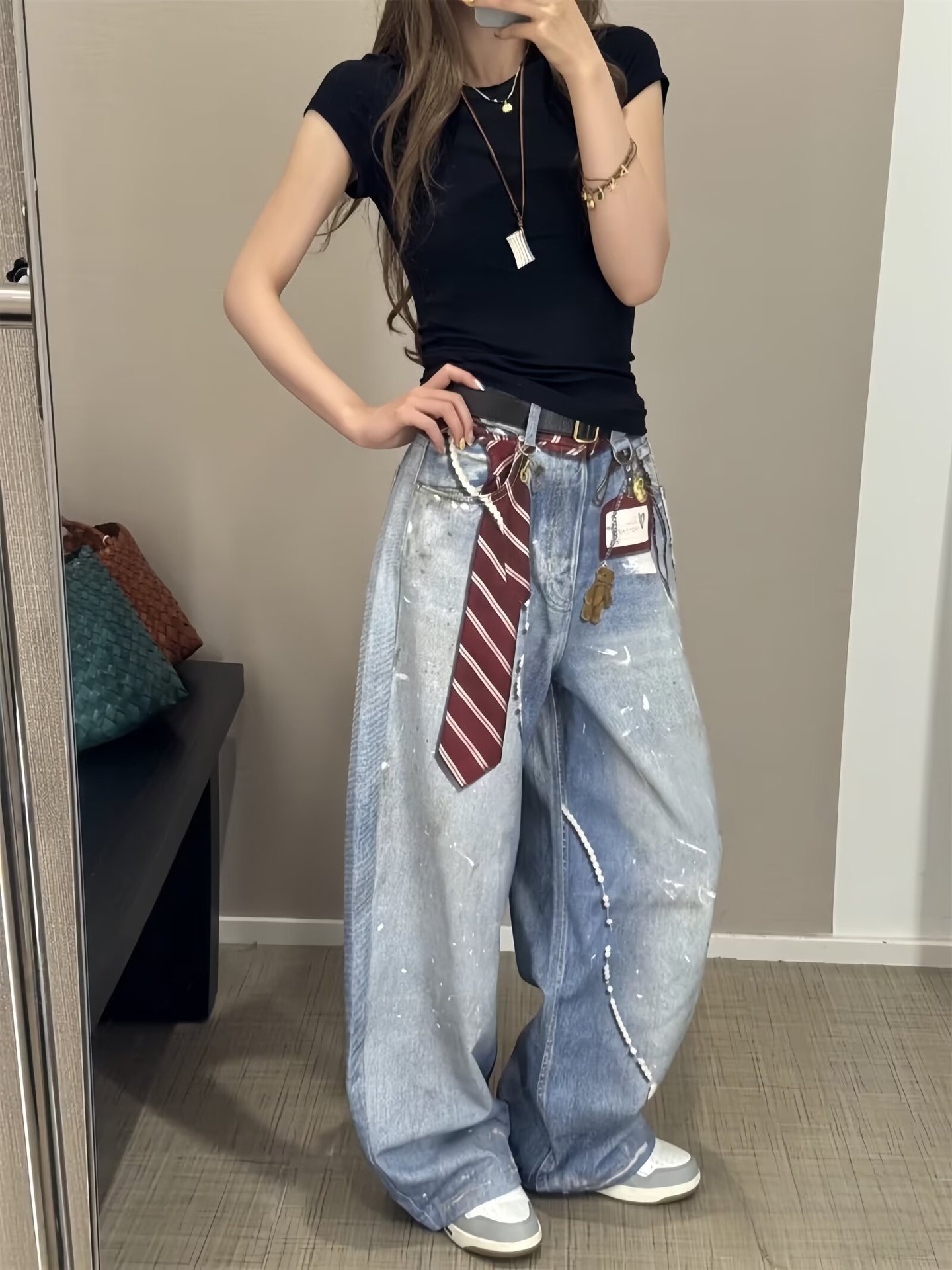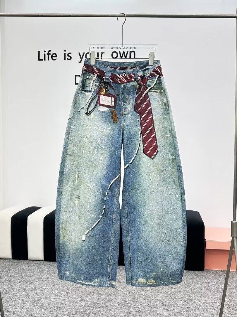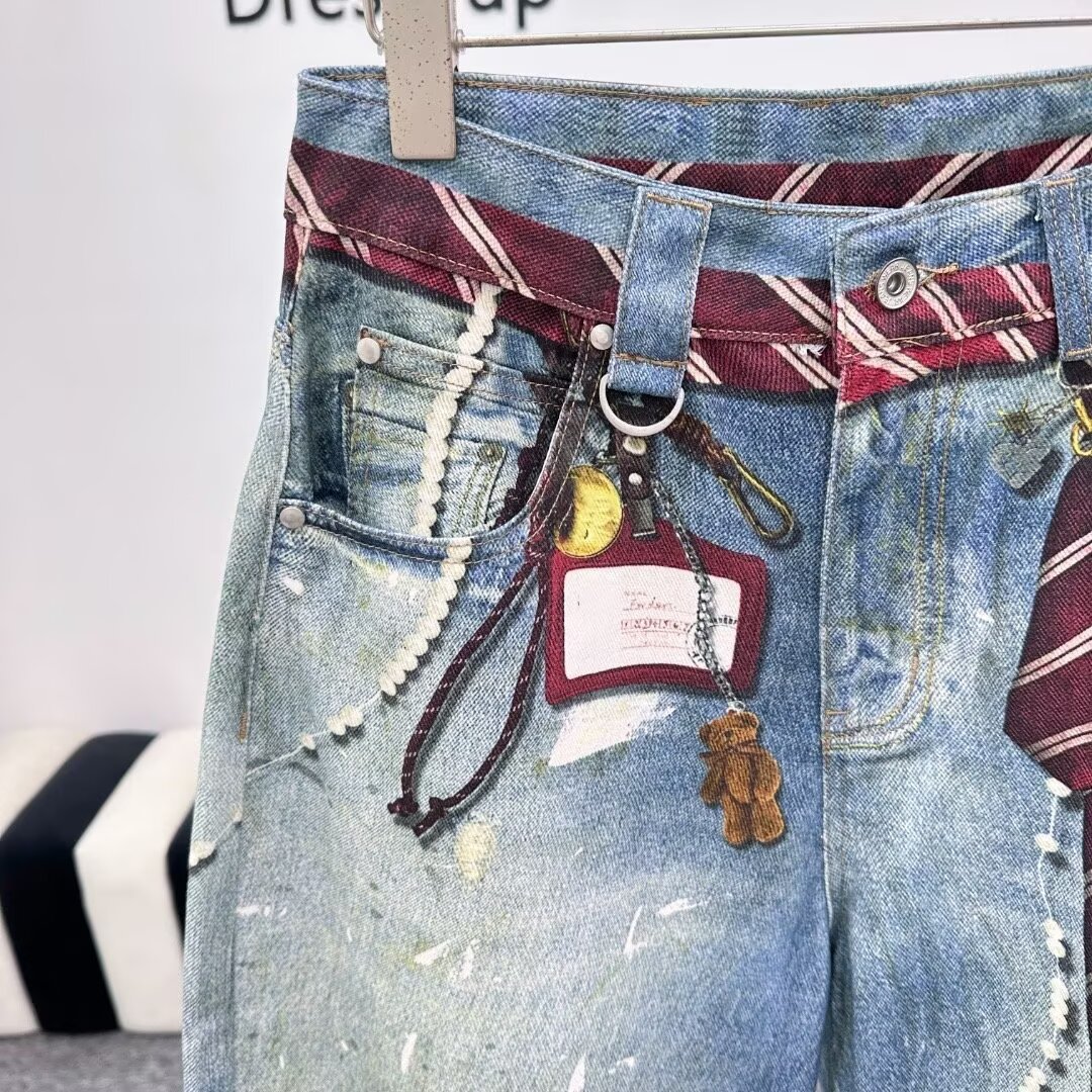 2025早秋新款链条吊坠领带泼墨水洗3D数码印花阔腿牛仔裤跨境外贸