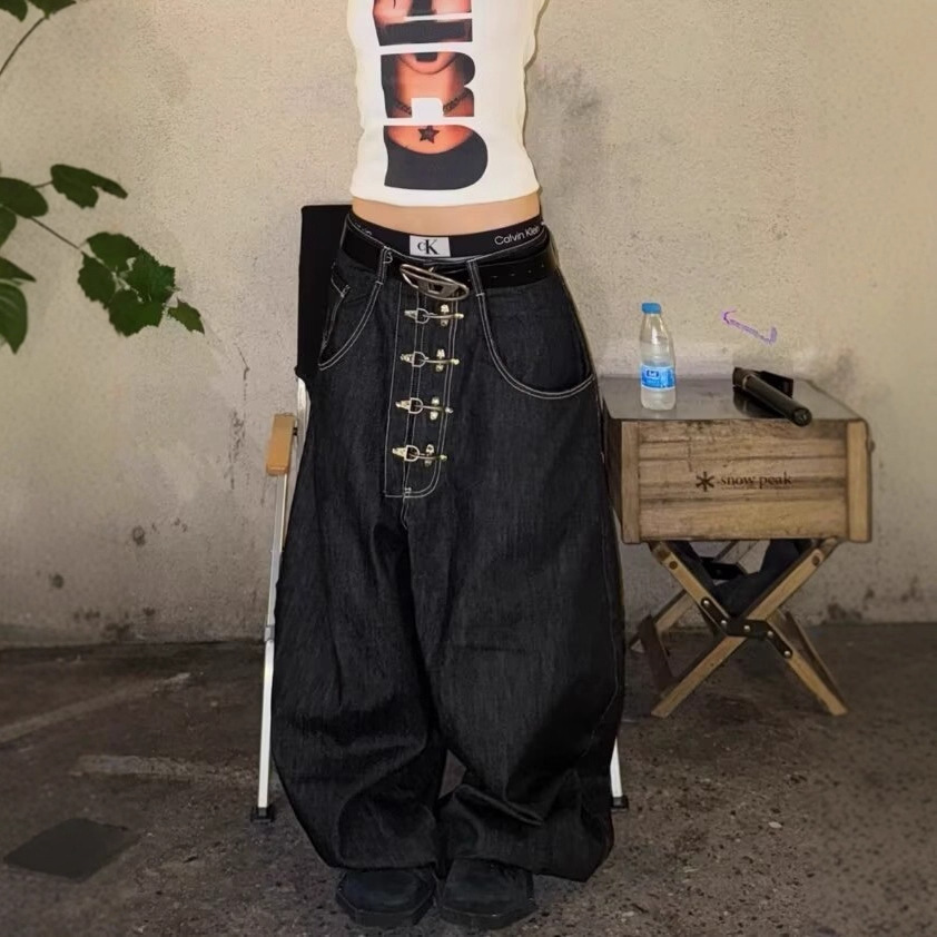个性街头美式复古高腰水洗牛仔裤秋季潮流铆钉设计感阔腿长裤潮流