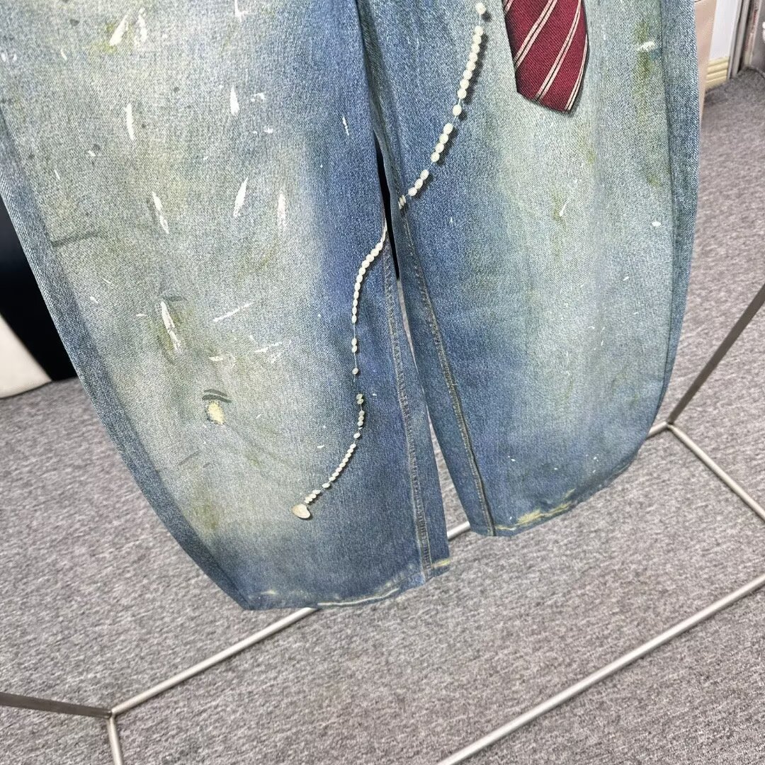 美式新款时尚潮牌设计3D打印蕾丝珍珠链条印花做旧牛仔裤男女同款