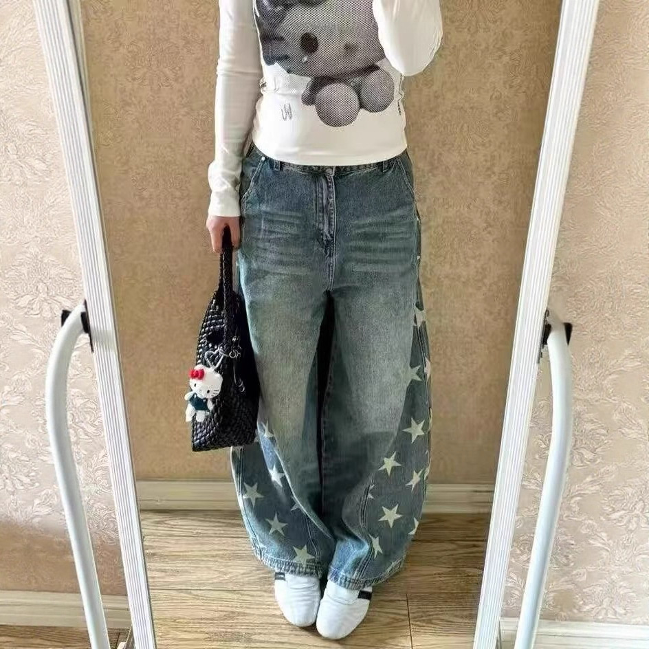 美式水洗星星牛仔裤女大众简约高腰复古直筒宽松显瘦阔腿坠感长裤