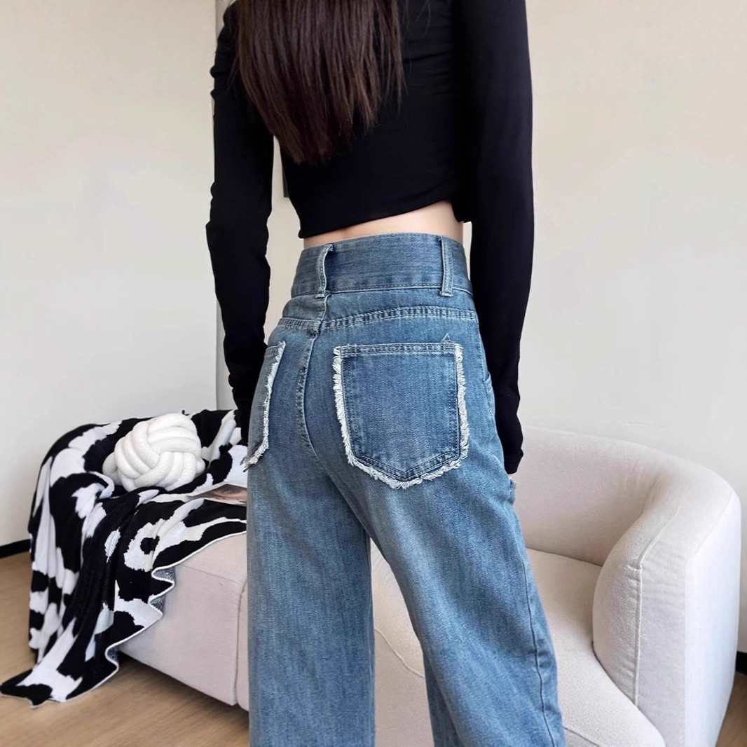新款翻边口袋毛边阔腿牛仔裤女秋季2025年高腰显瘦显高宽松直筒裤