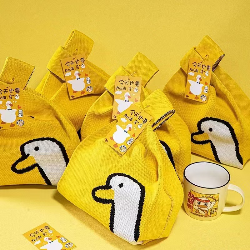 韓国の女子学生はニットのハンドバッグを背負っています。