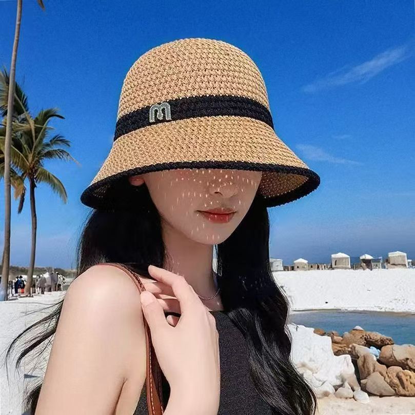 Ins日系日焼け止め麦わら帽子女性夏の旅行日よけ通気草編み漁師帽屋外海辺気質盆帽