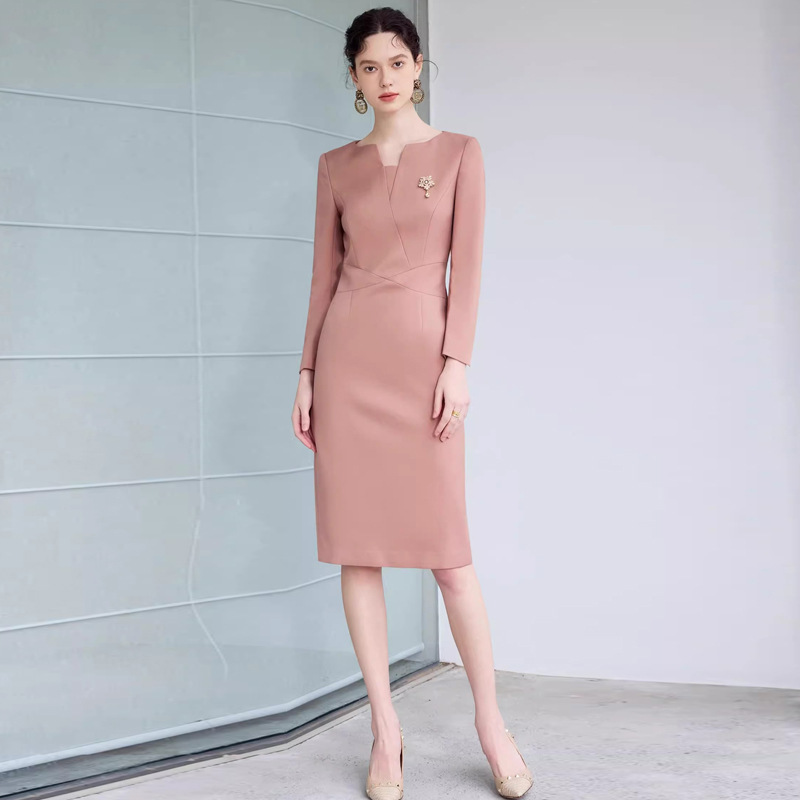 春秋时尚新款蜡粉色长袖V领职业女士连衣裙修身显瘦简约气质女裙