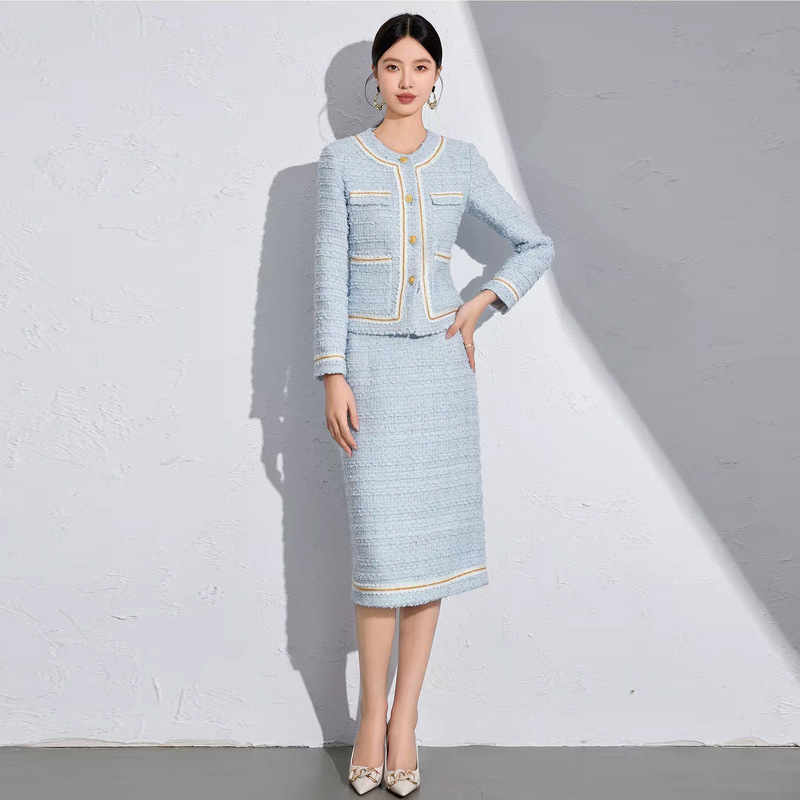 艾尚臣时尚小香风粗花呢浅蓝色西装套装收腰显瘦中长女裙正装秋冬
