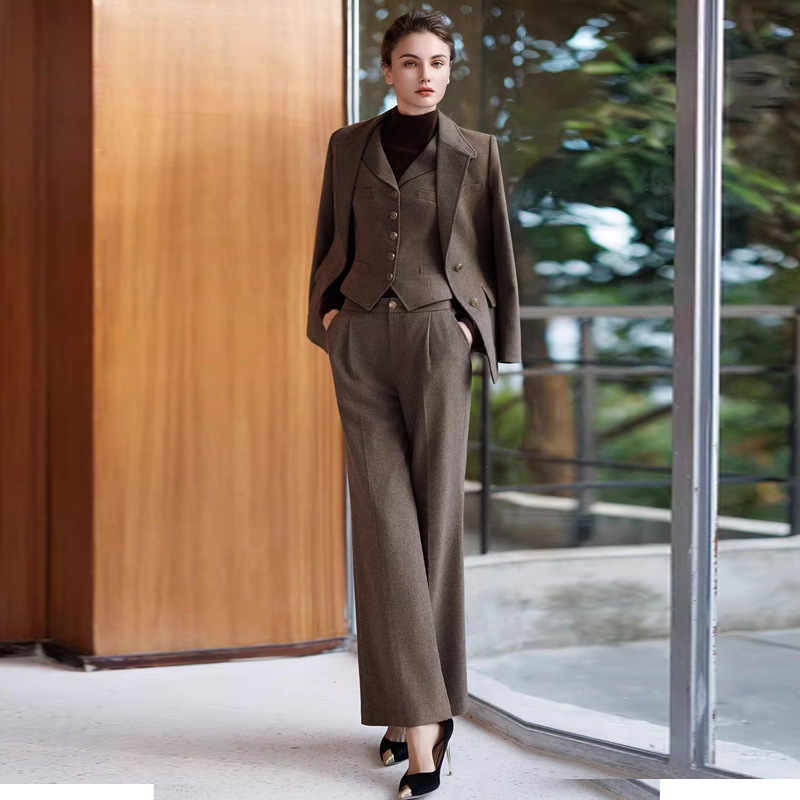秋冬时尚棕色羊毛西装套装简约时尚高级感气质马甲三件套正装套裤