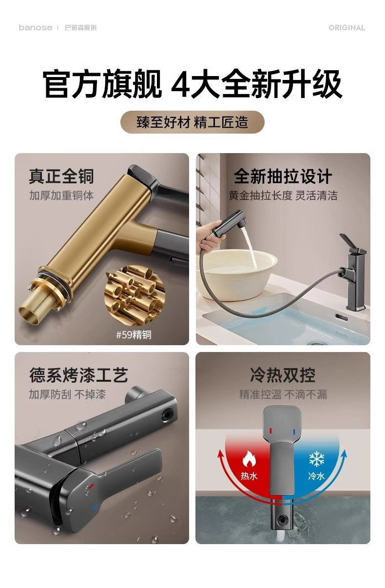 奶油风加厚枪灰抽拉式水龙头浴室冷热二合一卫生间洗漱台洗脸面盆