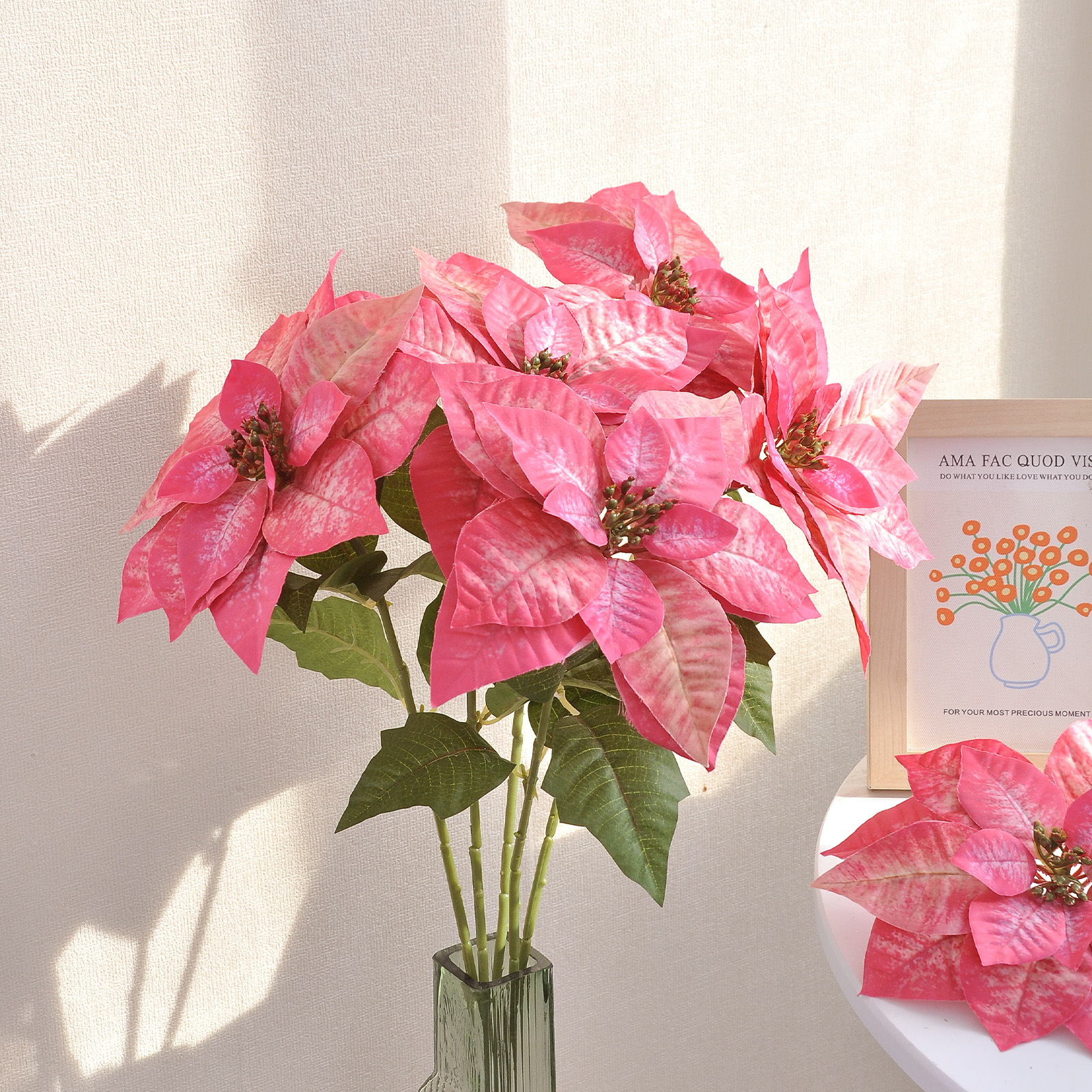 跨境单枝圣诞花一品红仿真圣诞花假花家居装饰花瓶插花室内装饰