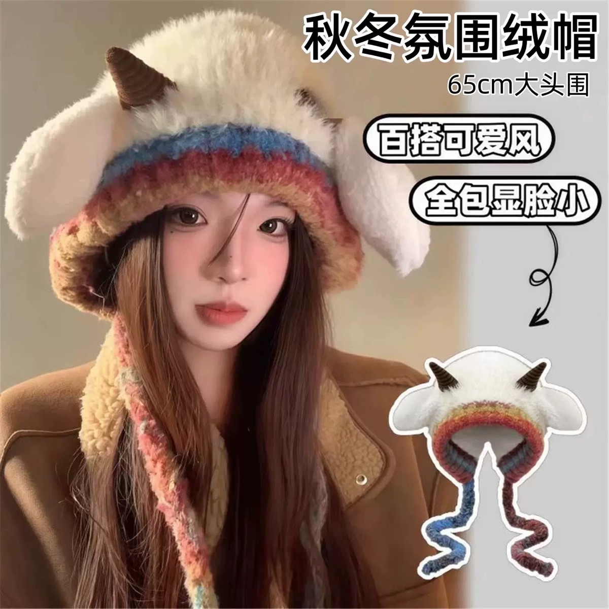 可爱小羊耳朵毛绒针织帽子女秋冬韩版保暖护耳防寒防风套头雷锋帽